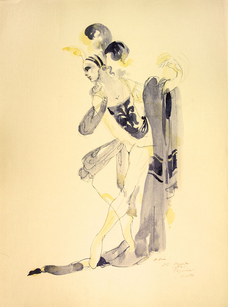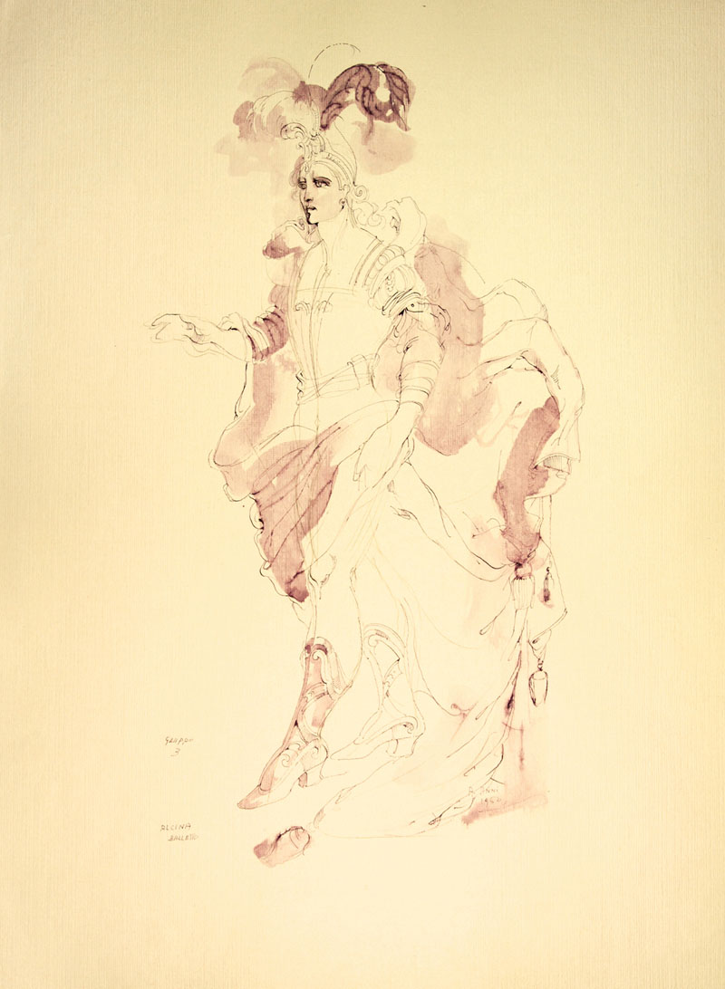 Anna Anni (1926-2011). Tre bozzetti per costumi teatrali. 1960 ca. Lotto composto da 3 disegni, matite e inchiostri colorati e acquerello su cartoncino vergato. mm 700x500 (ciascuno). Un disegno firmato e datato 1960. Uno firmato, datato 1960 e annotato «Gruppo 3 / Alcina / Balletto». Uno firmato e annotato «"Il Principe della Pagoda" / ballo». Ottima conservazione.