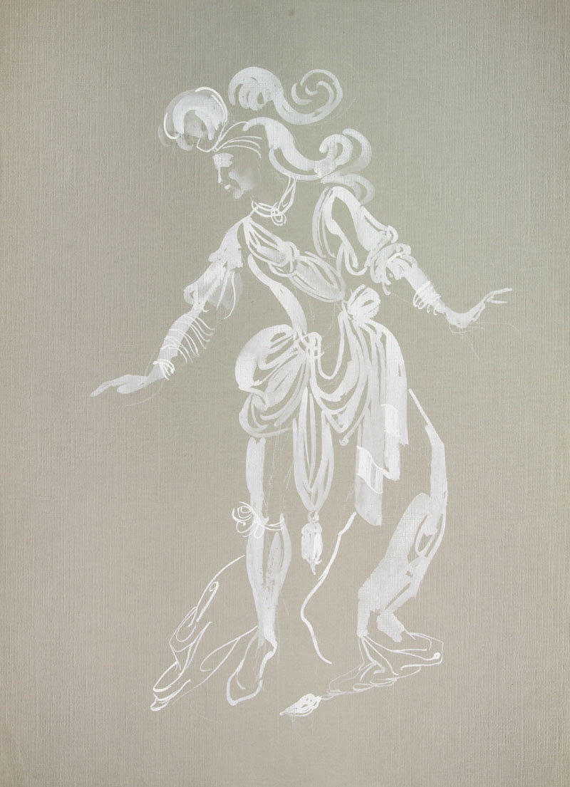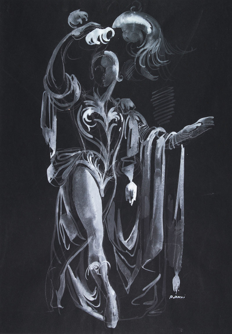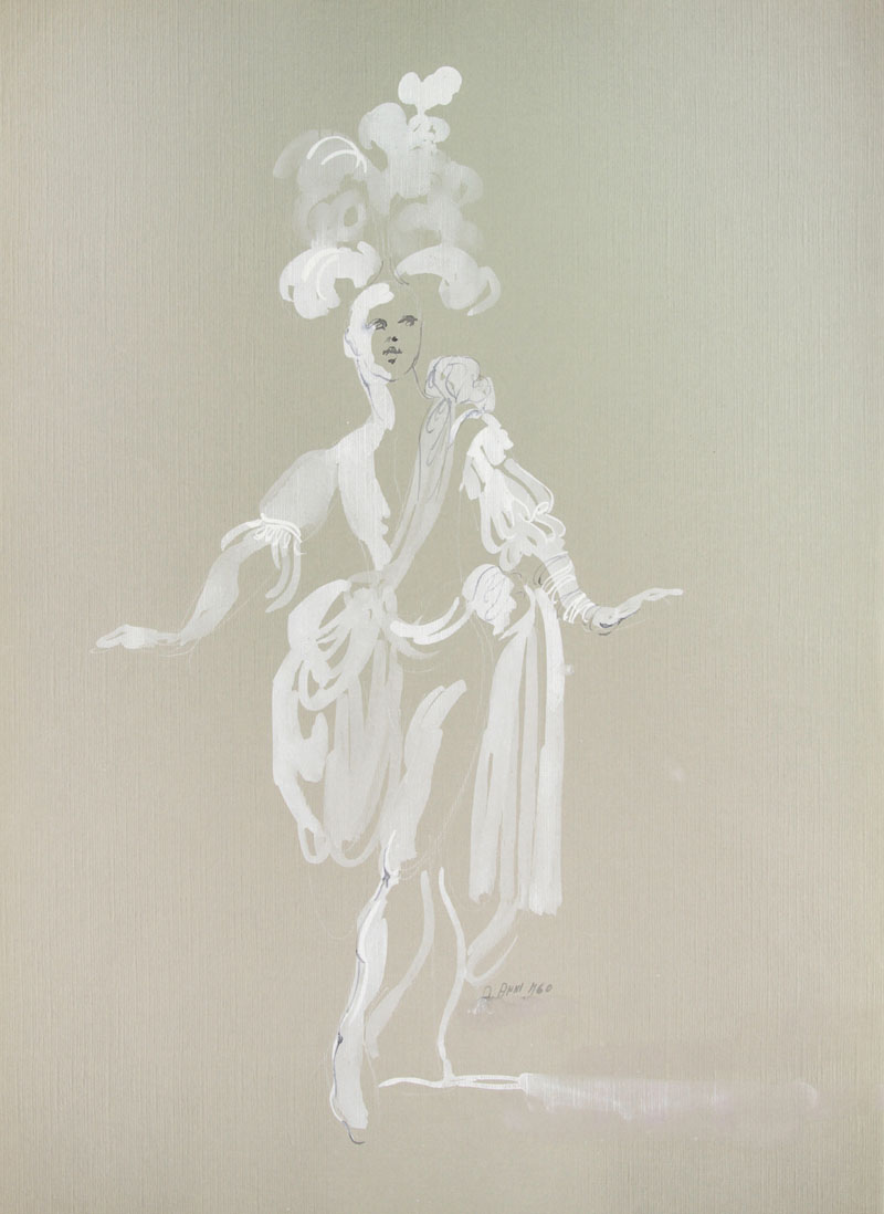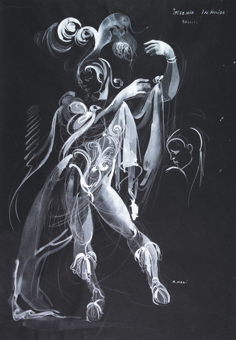 Anna Anni (1926-2011). Quattro bozzetti per costumi teatrali. 1960/68 ca. Lotto composto da 4 disegni, gessetto e tempera bianca su cartoncino vergato grigio (2 disegni, mm 700x500 ciascuno) e cartoncino nero (2 disegni, mm 480x340). Un disegno firmato e datato 1960, uno solo firmato e uno firmato e annotato «Ifigenia in Aulide / Ballo». Ottima conservazione, solo qualche residuo di colla al verso dei due disegni più piccoli.