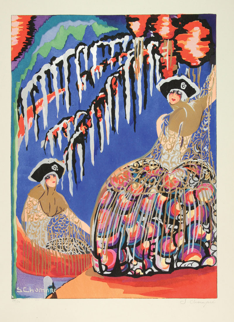 S. Chompré (Attivo a Parigi tra 1920 e 1930 ). Donne in costume settecentesco veneziano. 1920 ca. Pochoir mm. 420x304. Foglio: 642x494.  Firmato a matita in basso a destra. In basso a sinistra tiratura: es. n. 379/500. Ottima conservazione.