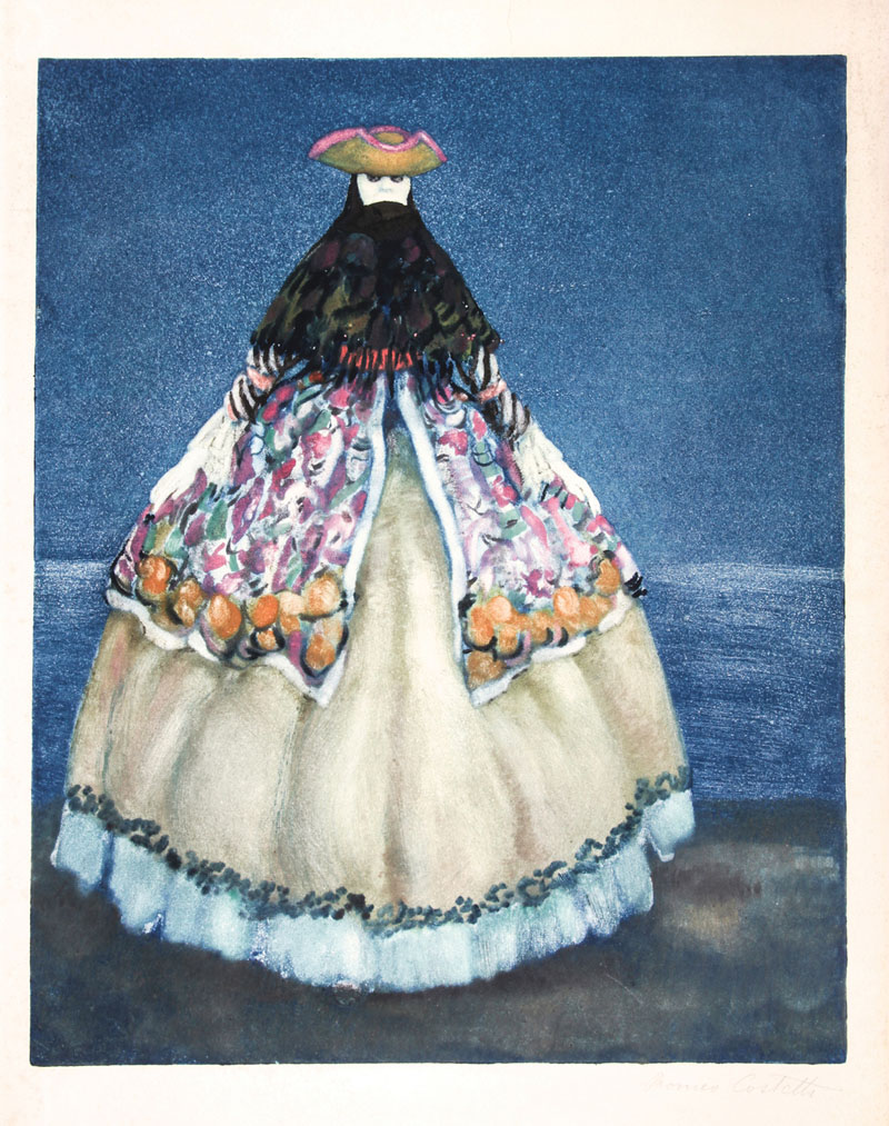 Romeo Costetti (1871-1957). Bautta veneziana. Monotipo a colori su carta pesante. mm 515x415. Foglio: mm 600x460. Firmato a matita in basso a destra. Bell'esemplare con buoni margini, uno strappo riparato al margine superiore al centro e traccia di gora visibile al verso.