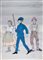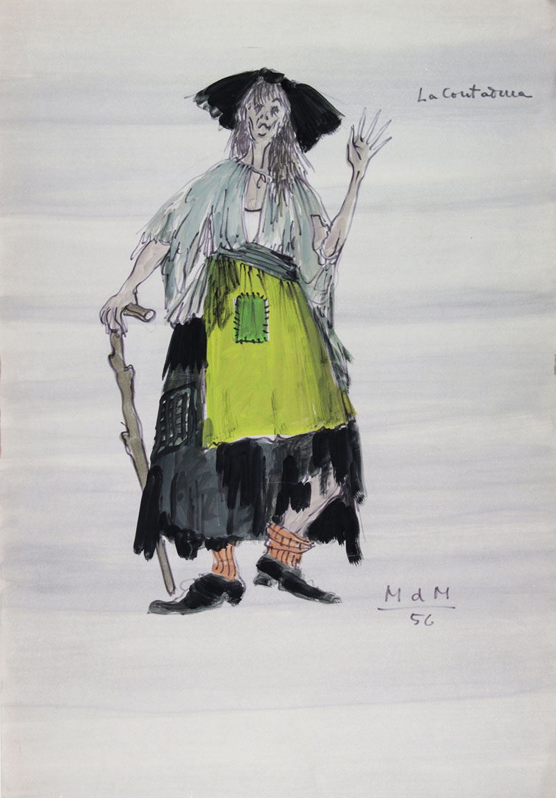 Maria De Matteis (1898-1988). Due bozzetti per costumi teatrali. 1956. Lotto composto da 2 bozzetti di costumi teatrali. Tempera policroma e pennarello nero su cartoncino tinto di grigio argentato. mm 500x350 (ciascuno). Entrambi siglati e datati in basso a destra; in alto a destra i nomi dei personaggi: «Peter e i 2 bambini» e «La Contadina», figure del dramma in tre atti Il diavolo Peter di Salvato Cappelli (regia di Alessandro Fersen). La prima dello spettacolo andò in scena al Piccolo Teatro Eleonora Duse di Genova, il 30 ottobre 1956. Al verso iscrizione a matita con indicazione dell'opera relativa ed etichetta con l'indirizzo manoscritto della Sartoria Annamaria che realizzò i costumi disegnati dalla De Matteis. Tracce di vecchio adesivo al verso visibili lievemente anche al recto dei margini, un piccolo strappo al margine sinistro di uno dei due fogli, ma nel complesso ottima conservazione.