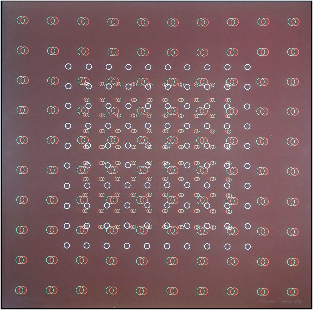 WILDING LUDWIG Grünstadt (GERMANIA) 1927 - 2010 "Senza titolo" Serigrafia su cartone Fabriano cm 68x68 del 1984. Firma, data e tiratura, 46/125, sul fronte in basso a sinistra (dotata di occhialini 3D per visionare effetti optical-cinetici). Facente parte della cartella "Exacta - dal Costruttivismo all'arte sistematica 1918-1985".