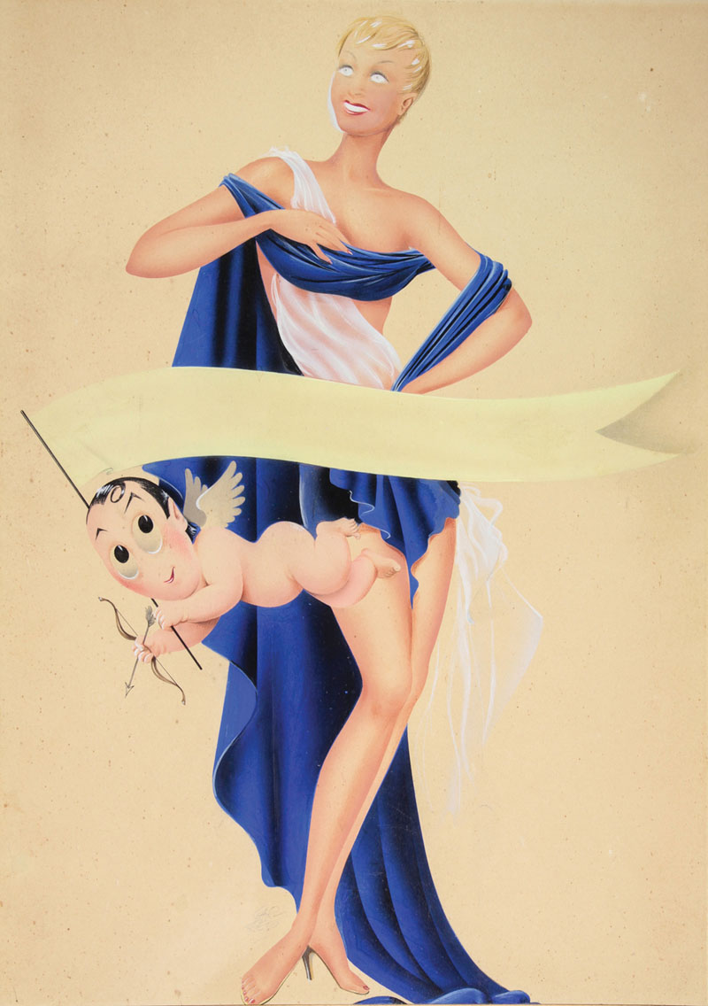 Paolo Federico Garretto (1903-1989). Votate per Venere. 1950 ca. Tempera policroma e matita su cartone. mm 485x344. Firmato a matita in basso a sinistra. Al verso note editoriali manoscritte. Bozzetto originale per il manifesto della rivista di varietà Votate per Venere di Dino Falconi e Orio Vergani, con Erminio Macario, Elena Giusti, Lauretta Masiero, Dorian Gray e Gino Bramieri (1950). Nel 1951, una tournée trionfale di questa rivista in Francia fu suggellata dalla presenza fra il pubblico parigino del Presidente De Gaulle. Garretto, dopo aver studiato architettura all'Istituto superiore di Belle Arti di Roma, fu notato da Orio Vergani per l'esecuzione di caricature di personaggi come Pirandello e Marinetti, e cominciò a collaborare con qualche giornale romano. Nel 1926 cominciò a fare caricature, soprattutto per testate britanniche, francesi e statunitensi. Negli Stati Uniti pubblicò su "Fortune", "Time", "New Yorker", "Vogue" e soprattutto su "Vanity Fair" (dove cominciò a collaborare nel 1930). Corrispondente negli anni Trenta per la "Gazzetta del popolo", creò anche personaggi a fumetti come Tabu e Putifarre per la Sezione dei piccoli del giornale. Durante la Seconda guerra mondiale collaborò anche con il quindicinale di teatro "Il dramma". Cartellonista, grafico editoriale e pubblicitario, dopo la guerra lavorò per il settimanale "Epoca" (Mondadori) e, nel 1956, meritò la medaglia d'oro della FIP (Federazione italiana della pubblicità) e la Maschera d'argento per le scenografie teatrali nel 1957. Residui di colla da vecchio montaggio al verso, ma ottima conservazione.