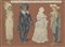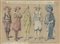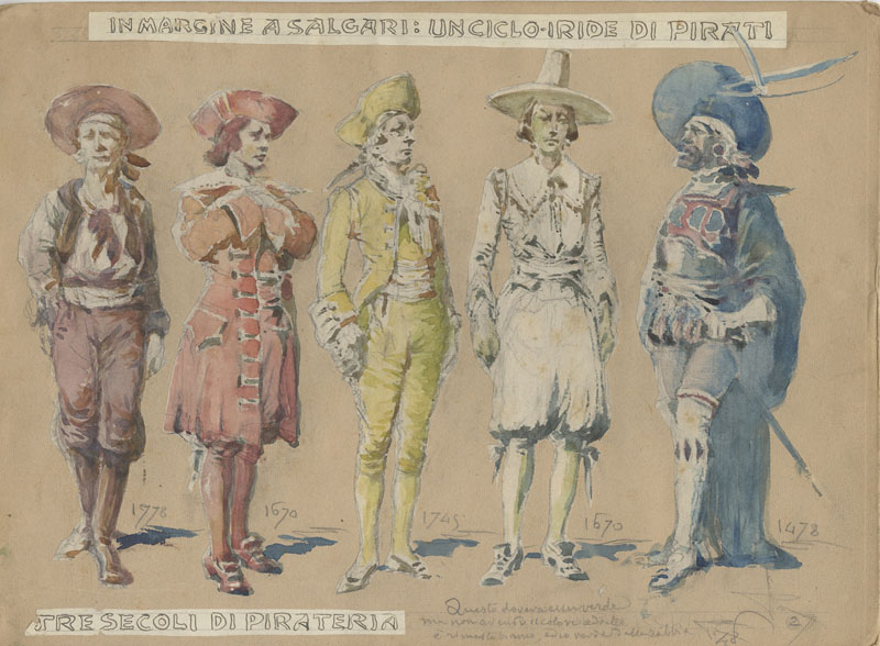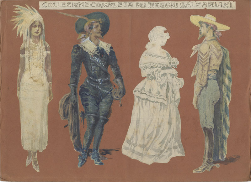Giuseppe Garuti (detto Pipein Gamba) (1868-1954). Disegni salgariani. 1- Quattro figurini (due maschili e due femminili) eseguiti ad acquerello, ritagliati e incollati su cartone marrone mm. 245x330. Incollata in alto una striscia di carta con la scritta a penna "Collezione completa dei disegni salgariani". 2- Cinque figurini maschili in costume da pirata eseguiti ad acquerello, ritagliati e incollati su cartone avana mm. 245x330. Incollate in alto e in basso due strisce di carta con la scritta a penna "In margine a Salgari: un ciclo iride di pirati / Tre secoli di pirateria". A matita in calce ad ogni figurino la rispettiva data dell'epoca; altre annotazioni e firma sempre a matita in basso. Gamba fu uno dei più congeniali illustratori dell'epica malese, dei corsari neri e dei misteri della giungla: non solo perché divenne amico e collaboratore di Salgari - che si era trasferito a Genova proprio in quegli anni per essere più vicino all'editore Donath - ma anche perché con lui condivideva gusto e fantasia, nonché l'idea stessa delle figure, dei tipi e dei luoghi più adatti a incarnare quella realtà. Con spiccata sensibilità favolistico-disegnativa illustrò una dozzina di romanzi di Salgari - pubblicati da Donath ma anche da altri editori - fra i quali I pirati della Malesia, I Robinson italiani, La rosa del Dong-Giang (editi nel 1896), Le stragi delle Filippine (1898), La capitana dello Yucatan (1899), Le tigri di Mompracem (1900), La regina dei Caraibi e Il fiore delle perle (entrambi del 1901). I risultati migliori del connubio con Salgari si ebbero con Il corsaro nero (1898). L'esotismo dei luoghi, la teatralizzazione delle gesta e dei sentimenti, l'eroicità dei protagonisti, l'abbondante ricchezza e la minuziosità necessarie a rendere i costumi e gli accessori dei personaggi, si adattavano alla sua innata capacità "operistica" e scenografica ma anche lo portavano a evidenziare certi aspetti grotteschi e caricaturali, sottilmente divertiti e fin de siècle. Lievi tracce d'uso.