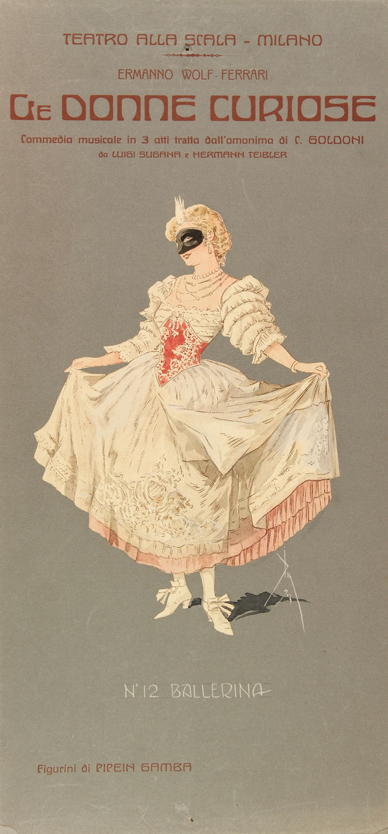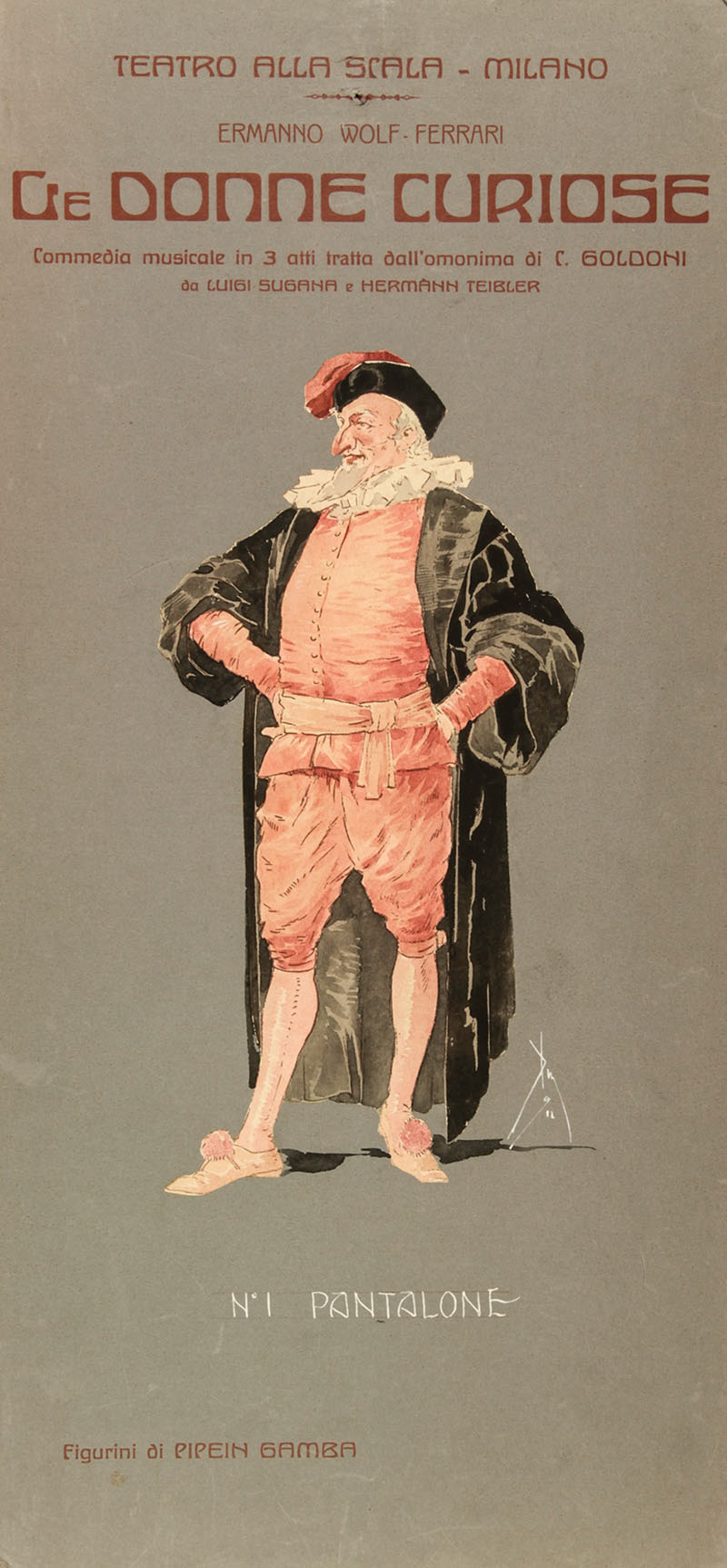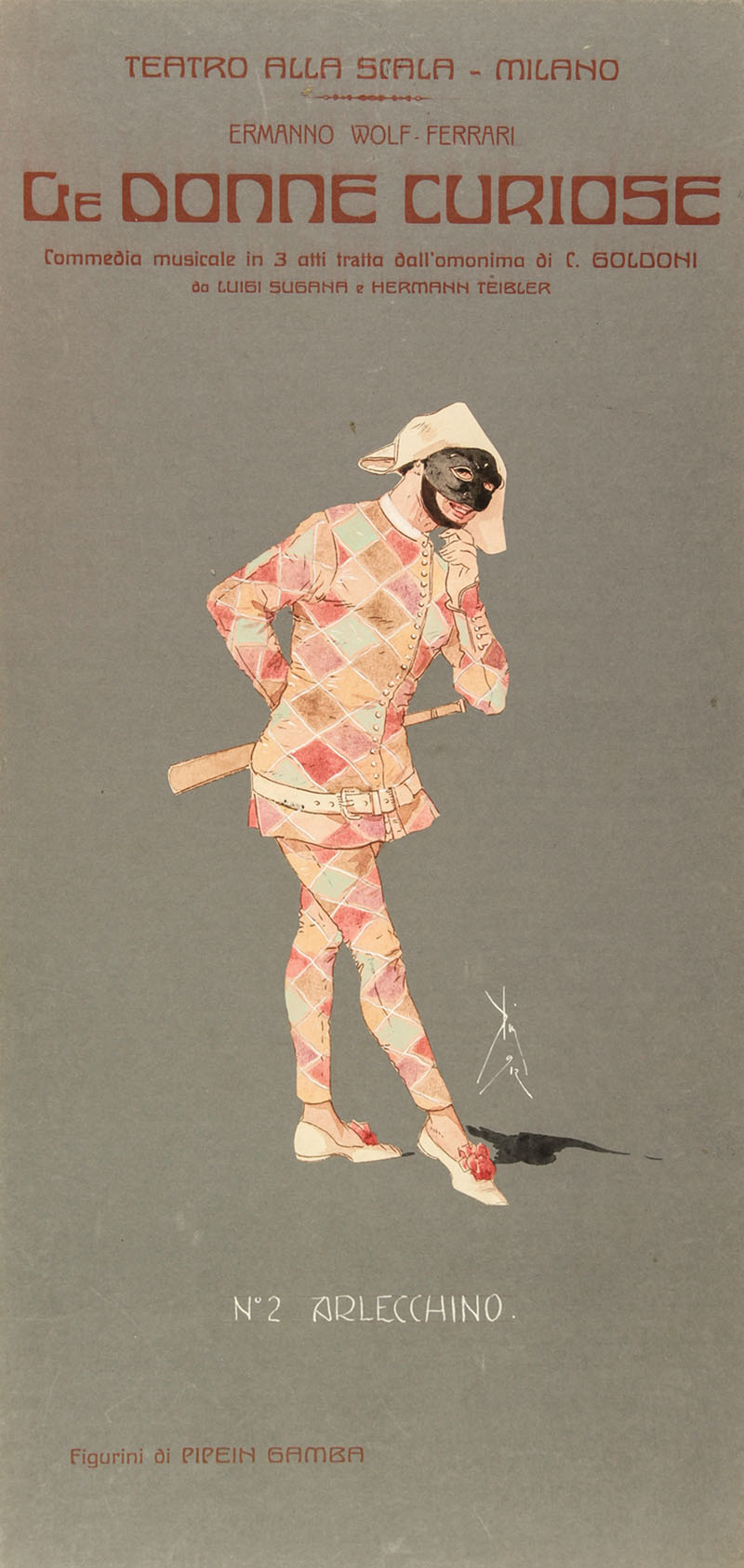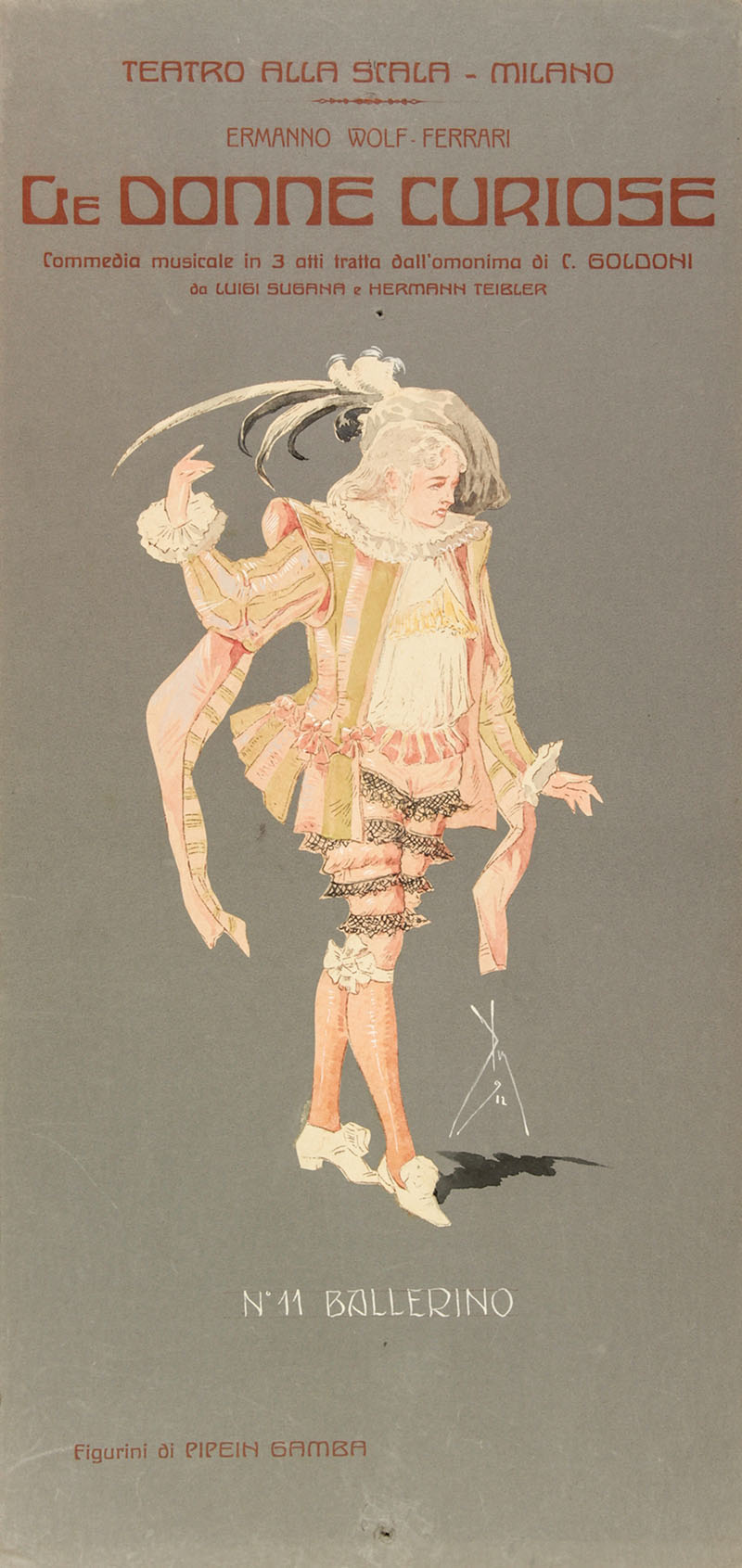 Giuseppe Garuti (detto Pipein Gamba) (1868-1954). Figurini teatrali per Le donne curiose. Teatro della Scala, Milano.1912. N. 20 disegni a penna e acquerello ritagliati e incollati su cartoni editoriali mm. 480x230. Numerati 1-24 (mancano nn. 4, 7, 13, 14). Tutti firmati dall'artista e tranne uno datati 1911 e 1912. Ogni cartone reca in alto la scritta tipografica in rosso "Teatro alla Scala – Milano, Ermanno Wolf -Ferrari, Le donne curiose, commedia musicale in tre atti tratta dall'omonima c. di Goldoni da Luigi Sugana e Hermann Teibler". In basso ogni cartone reca numero progressivo, nome del personaggio e la scritta in rosso "Figurini di Pipein Gamba". -