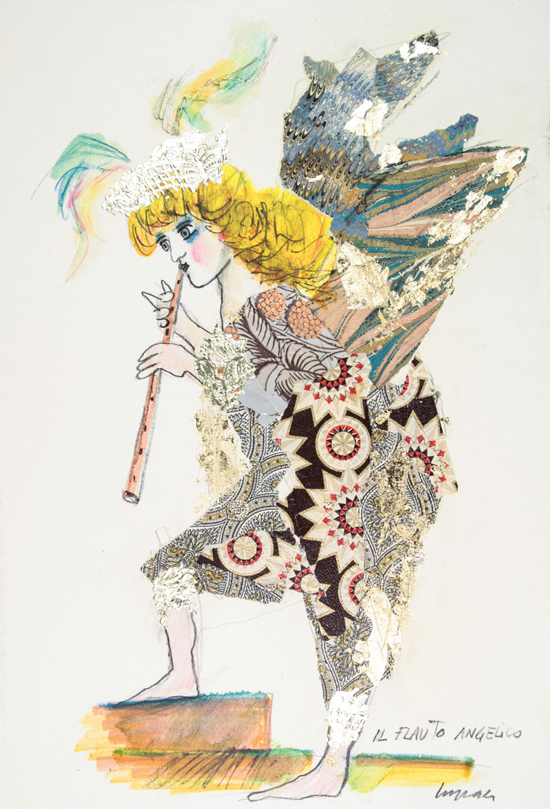 Emanuele Luzzati (1921-2007). Il flauto angelico. Tecnica mista su cartoncino...