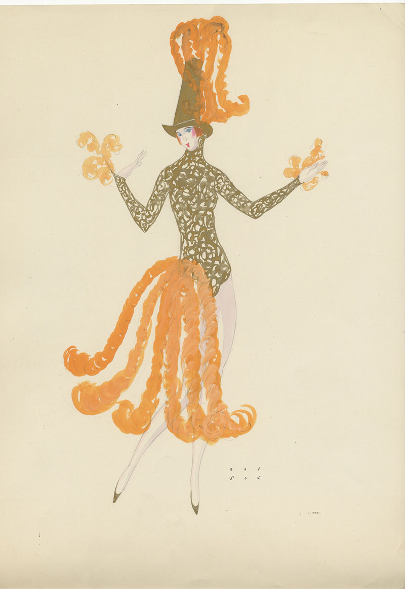 Gontran René Ranson (1888-1977). Bozzetto di costume per Le Folies Bergère. 1924/32 ca. Tempera oro e arancione e matita su cartoncino avorio. mm 445x325. Firmato a penna in basso a destra. Ottima conservazione.