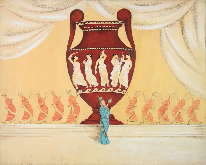 Titina Rota (1899-1978). Bozzetto per una scenografia teatrale. Tempera, matita e oro su cartoncino avorio applicato a cartone. mm 337x425. Firmata in basso a destra. Nipote di Giovanni Rinaldi (compositore e autore di Casa Ricordi), figlia di un'apprezzata concertista e cugina del celebre Nino Rota, Titina da giovane violinista frequentò Igor Stravinskij, Alfredo Casella e Gabriele d'Annunzio, grande ammiratore dei suoi disegni. Studiò e lavorò come vetrinista e disegnatrice; a trentadue anni debuttò curando i costumi della Locandiera di Goldoni con Tatiana Pavlova all'Odeon di Milano (1931). Poi approdò, chiamata da Guido Salvini, alla Scala e creò indimenticabili scene e costumi di opere liriche anche per il Maggio Fiorentino, il teatro Comunale di Firenze, l'Opera di Roma, la Fenice di Venezia. Si dedicò anche al teatro di prosa collaborando con famosi registi come Max Reinhardt e Renato Simoni e interpreti di primo piano. La sua estetica si ispirò all'art déco, con il tratto del disegno deciso e insieme leggero, coloratissimo e talvolta surreale. Ottima conservazione.