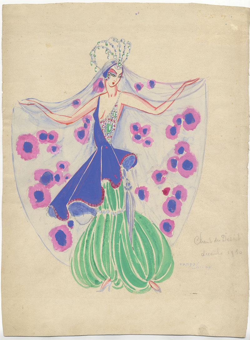 Freddy Wittop (1911-2001). Chant du désert. 1930. Gouache, matita e rialzi a tempera d'argento su cartoncino avorio. mm 393x293. Firma, data e titolo in basso a destra. Bozzetto di costume per l'operetta Le Chant du désert. Minima abrasione della carta nell'angolo superiore destro, residui di nastro adesivo di carta al verso, per il resto ottima conservazione.