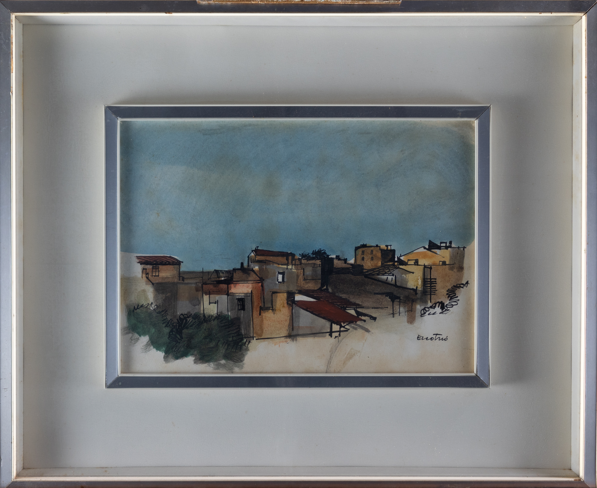 Enotrio Pugliese (Buenos Aires 1920 – Pizzo, VV 1989), Case dall'alto, Tecnica mista su masonite, 25x35 cm.