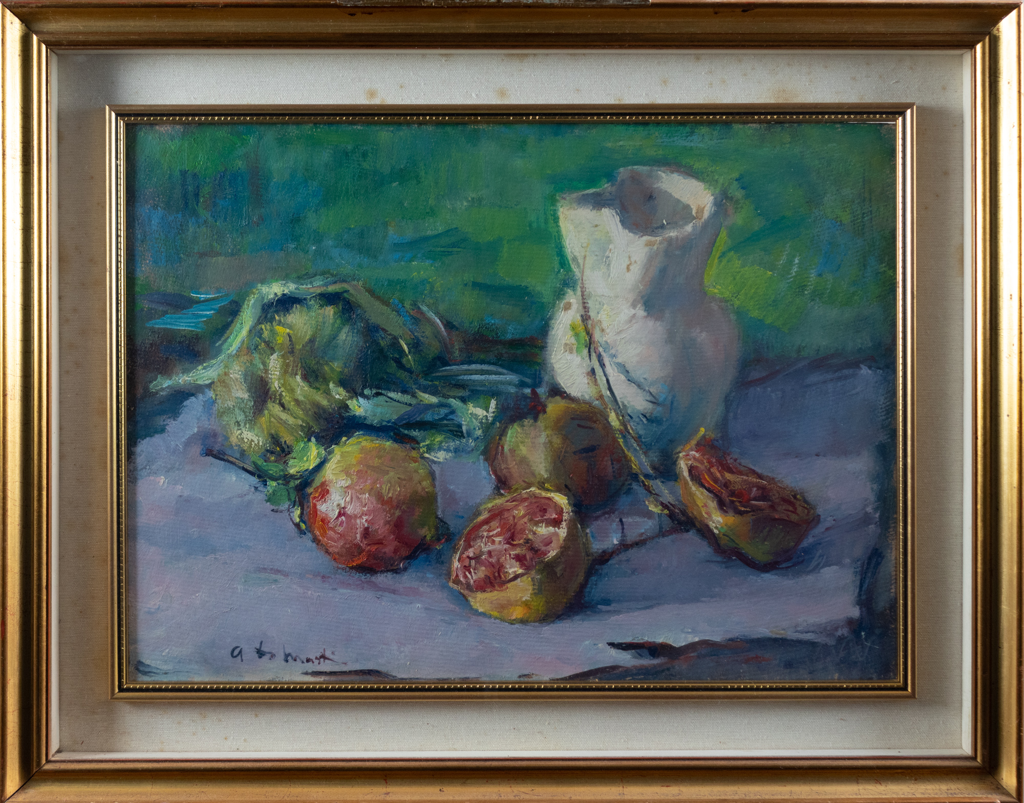 Alfredo De Martino (Napoli, 1928), Melograni, Olio su cartone, 37x50 cm.