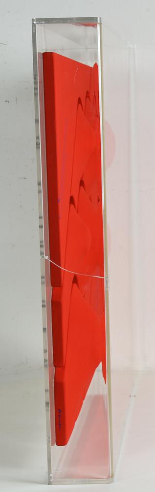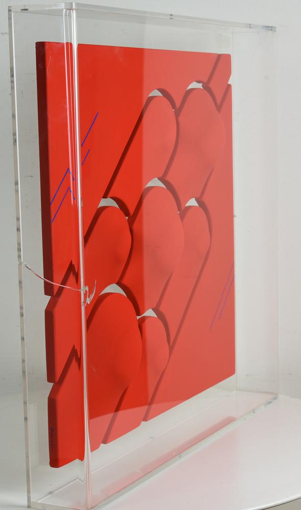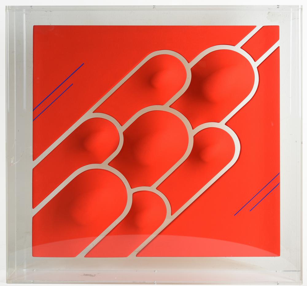 acrilico su tele sagomate e assemblate entro teca in plexiglas, cm 60x60x10