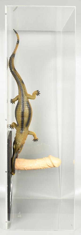 assemblaggio in resina e acrilico su legno entro teca in plexiglass, cm 100x40x28