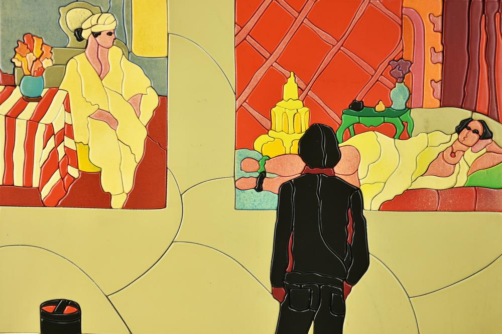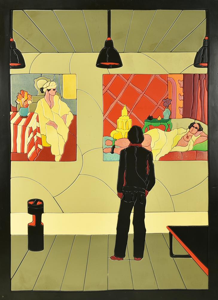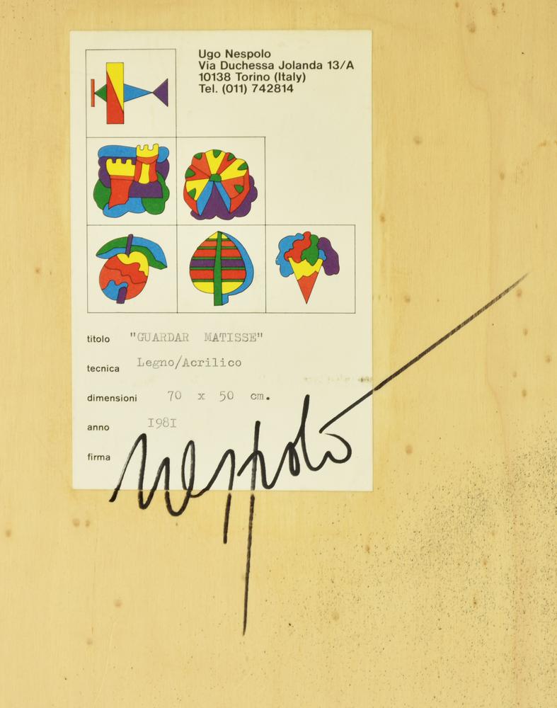 Ugo Nespolo, (1941) GUARDAR MATISSE acrilico su legno, cm 70x50 sul retro:...