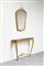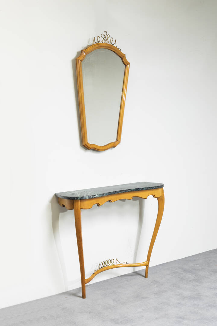 Console con specchiera in legno chiaro, particolari in ottone, piano in marmo verde Alpi.