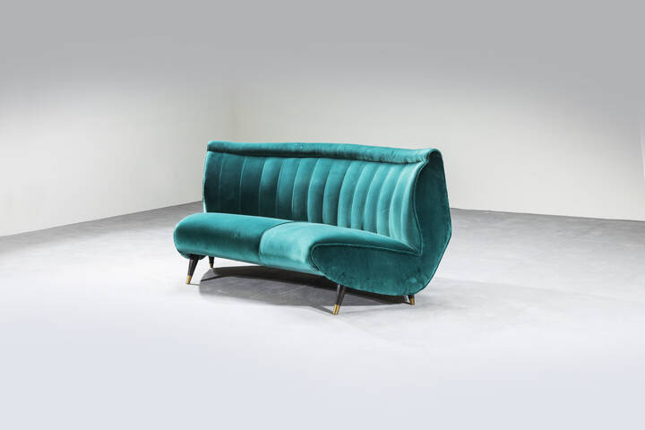 Divano curvo con imbottitura rivestita in velluto, gambe in legno con terminali in ottone.