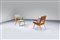 Coppia di poltroncine con struttura in legno, imbottitura rivestita in vinilpelle.