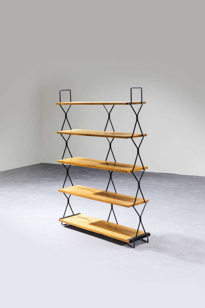 Libreria in legno chiaro, montanti in tubolare di ferro verniciato.
