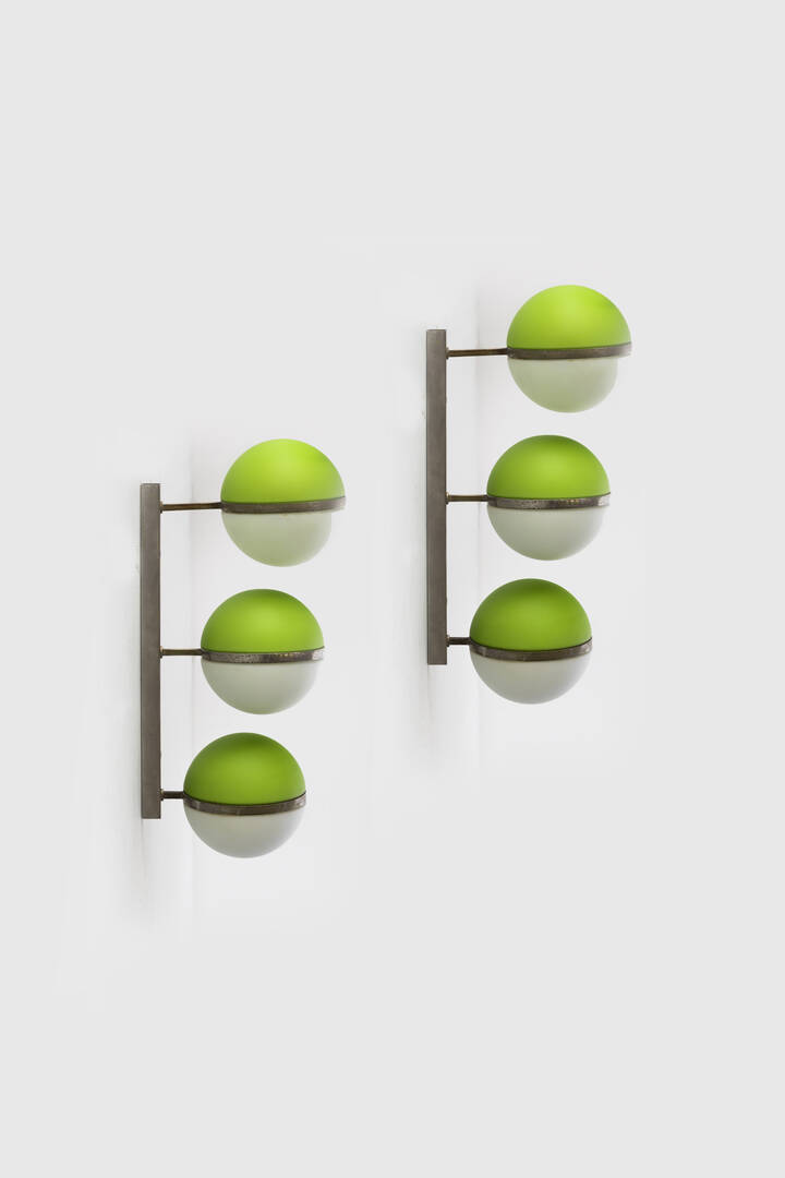 Coppia di appliques in acciaio con diffusori in vetro colorato e vetro satinato.