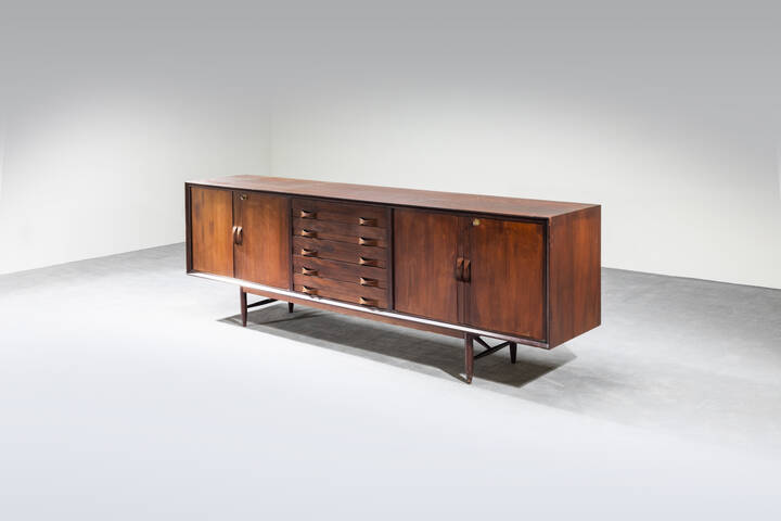 Sideboard in legno, fronte a quattro sportelli e cinque cassetti.