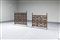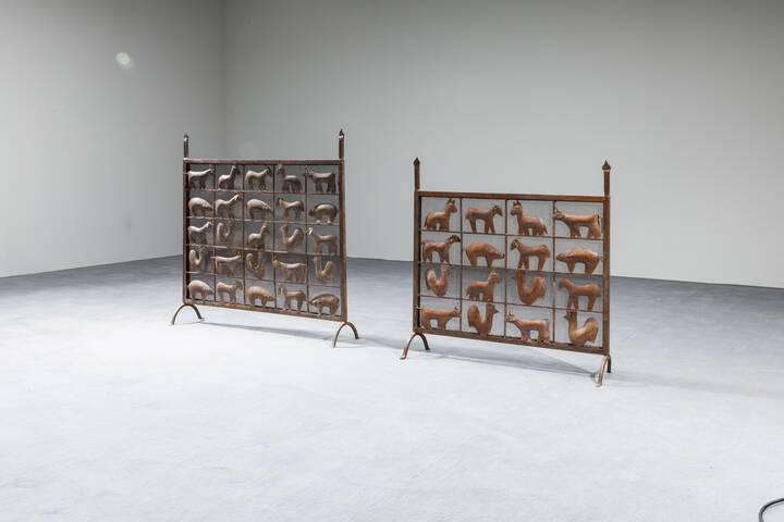 Coppia di parascintille in ferro battuto con decorazioni di figure animali stilizzate.