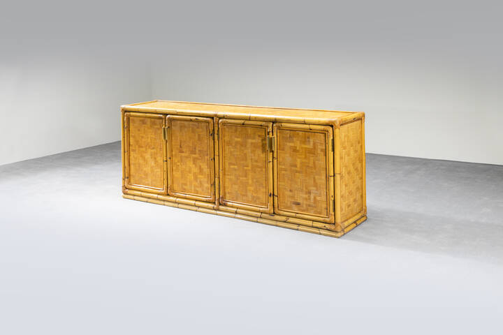 Grande credenza a quattro ante con struttura in bamboo e particolari in ottone.