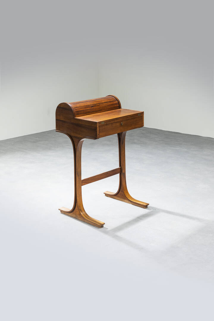 Scrittoietto in legno a serrendina celante cassetto e vani portacarte.