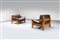 Coppia di poltrone con struttura in legno, cuscini imbottiti rivestiti in pelle.