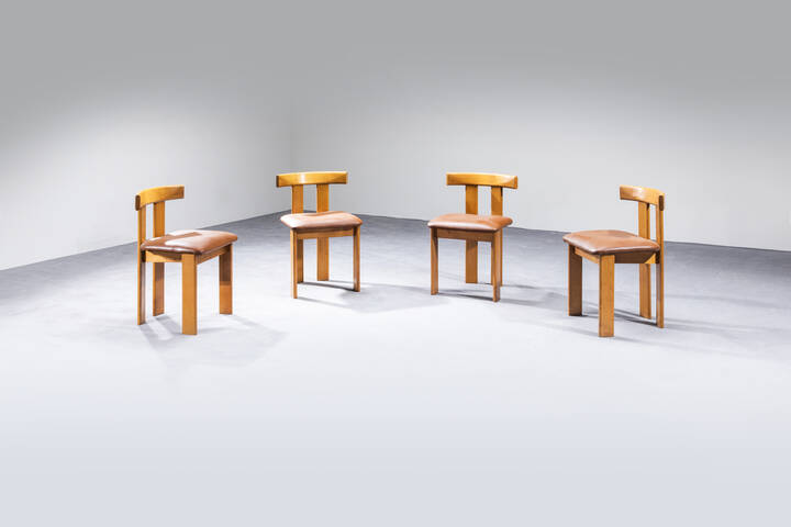 Quattro sedie con struttura in legno, sedute imbottite rivestite in vinilpelle.
