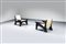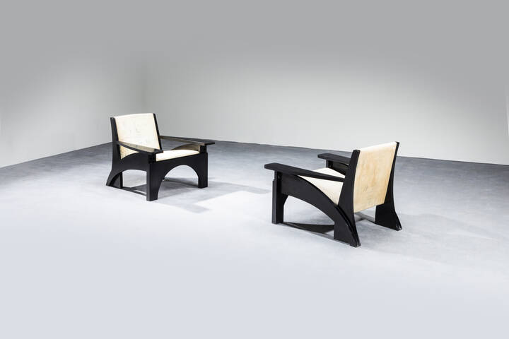 Coppia di poltrone con struttura in legno laccato, cuscini imbottiti rivestiti in tessuto.
