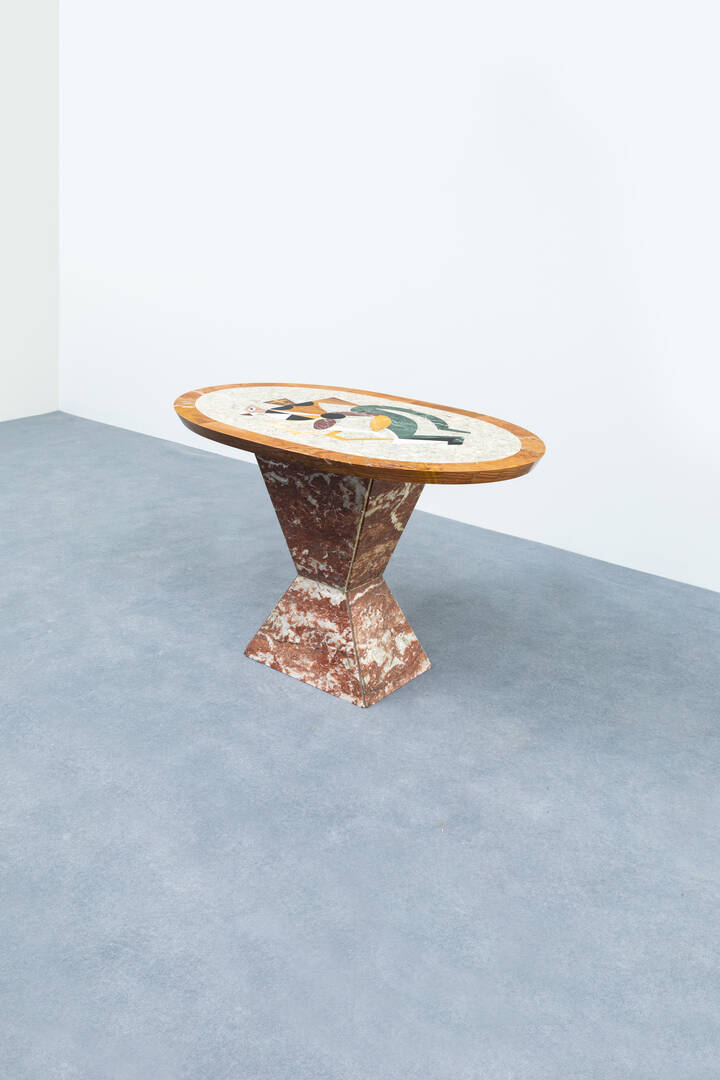 Tavolo in marmo intarsiato con decoro realizzato dalla combinazione di marmi di diverse colorazioni.