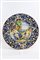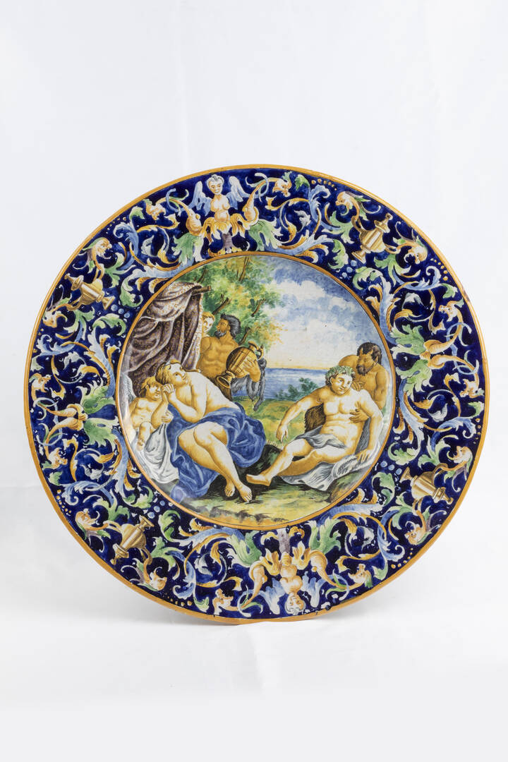 in ceramica invetriata e dipinta con scena amorosa tra ninfe e fauni. Manifattura Deruta, siglato al retro
