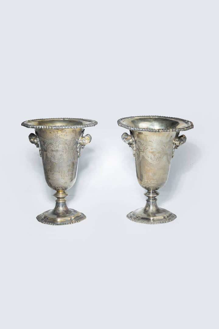 Corpo inciso con decori vegetali; prese a volute; bocca e base con bordo sagomato e decorato a baccelli.