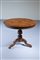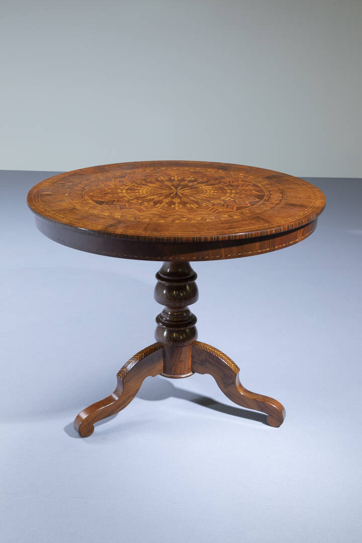 in legno di noce; colonna centrale lavorata a rocchetto terminante con con tre piedi a volute. Piano rotondo interamente intarsiato a motivi geometrici in essenze pregiate
