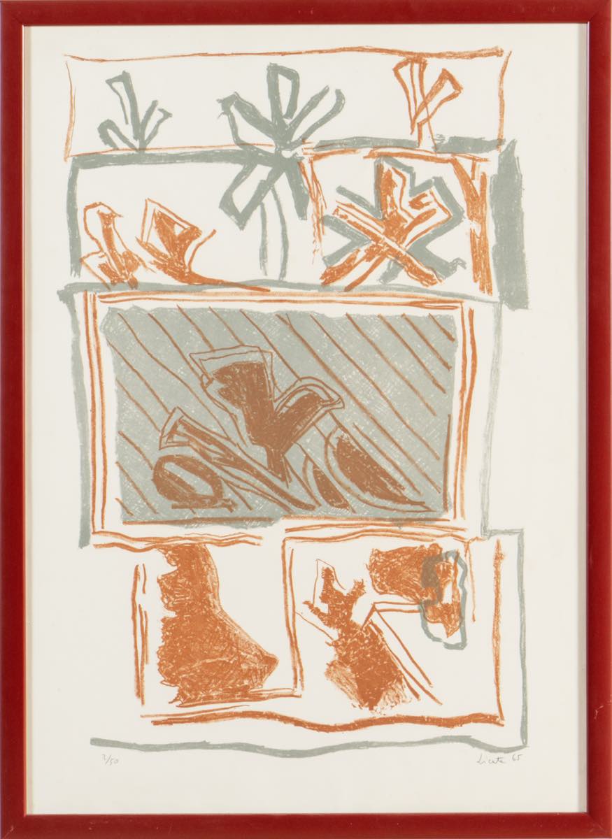 Riccardo Licata (Torino 1929 - Venezia 2014), “Senza titolo”, 1965. Litografia a colori su carta, firmata e datata in basso a destra, numero di tiratura in basso a sinistra 2/50, Foglio H cm 70x50