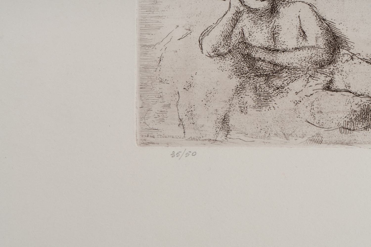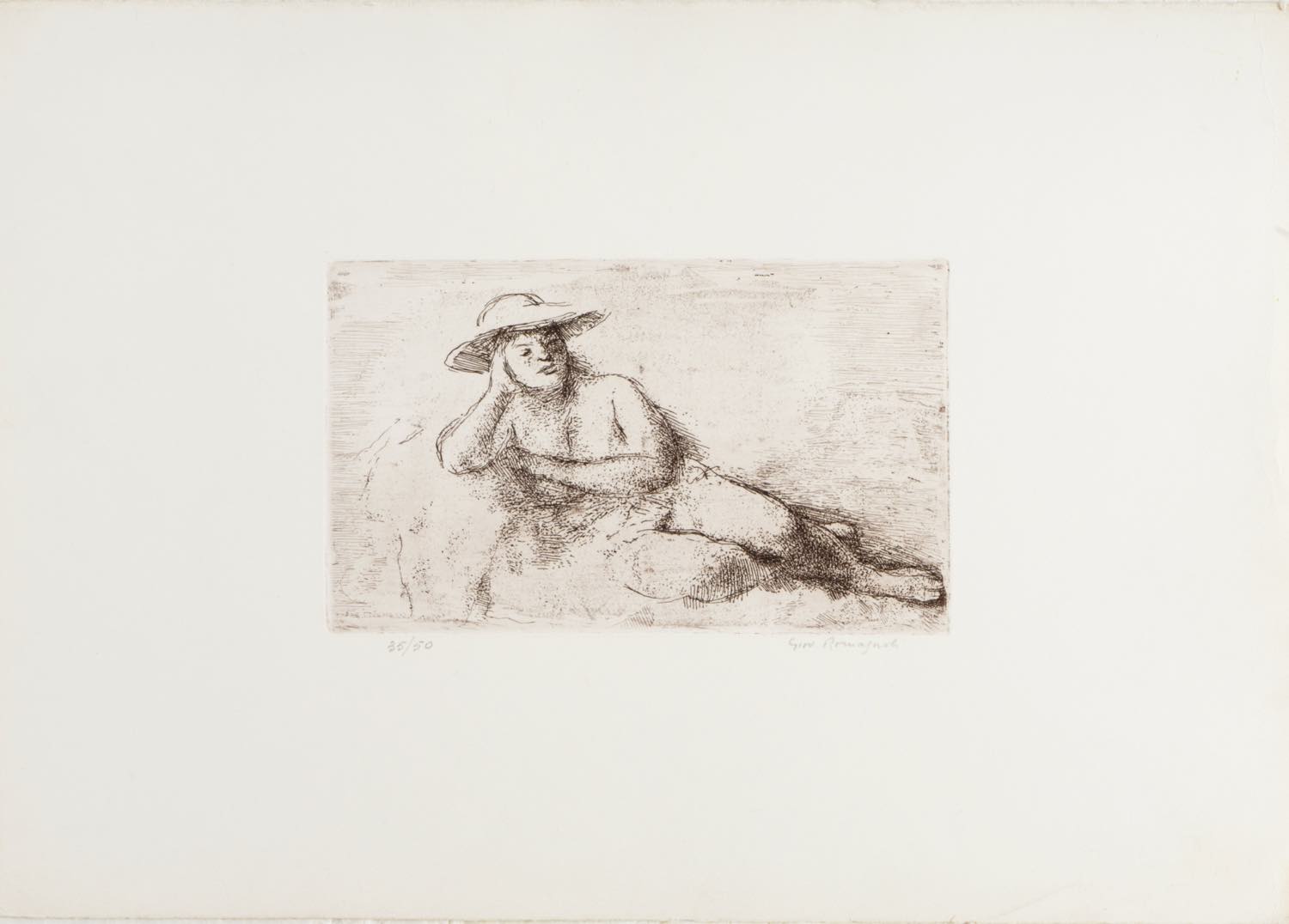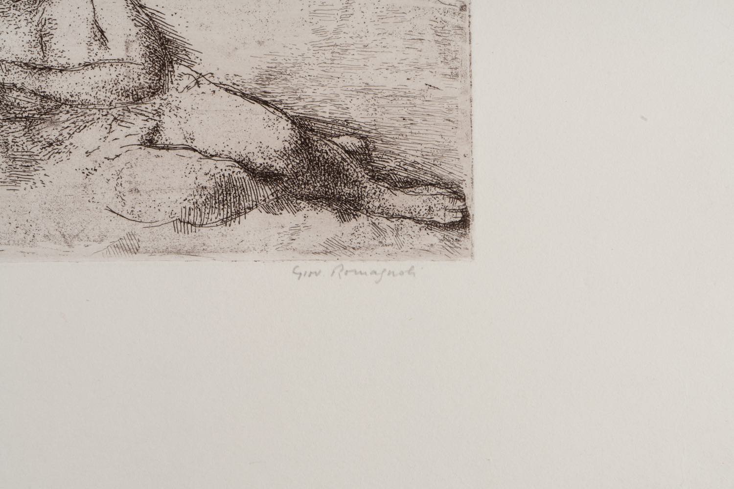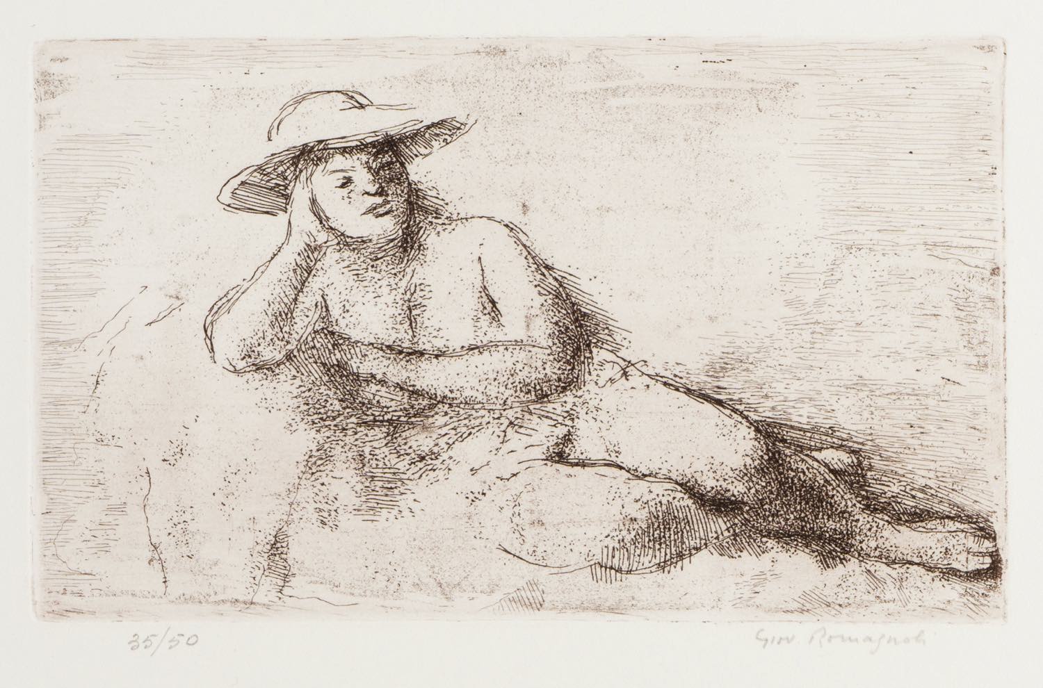 Giovanni Romagnoli (Faenza 1893 - Bologna 1976), “Figura femminile distesa”. Acquaforte su carta, firmata in basso a destra, numero di tiratura in basso a sinistra 35/50, Lastra H cm 14x24 (lievi usure al foglio)