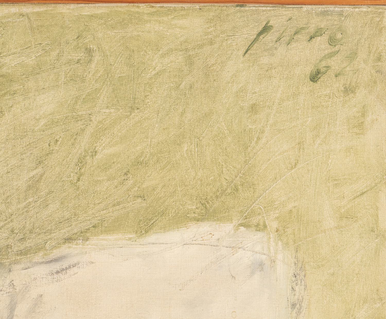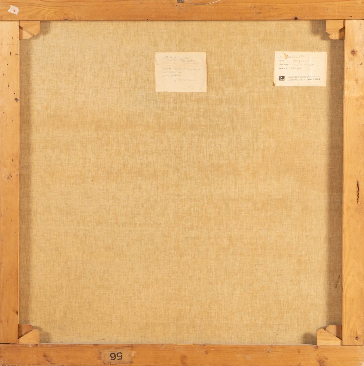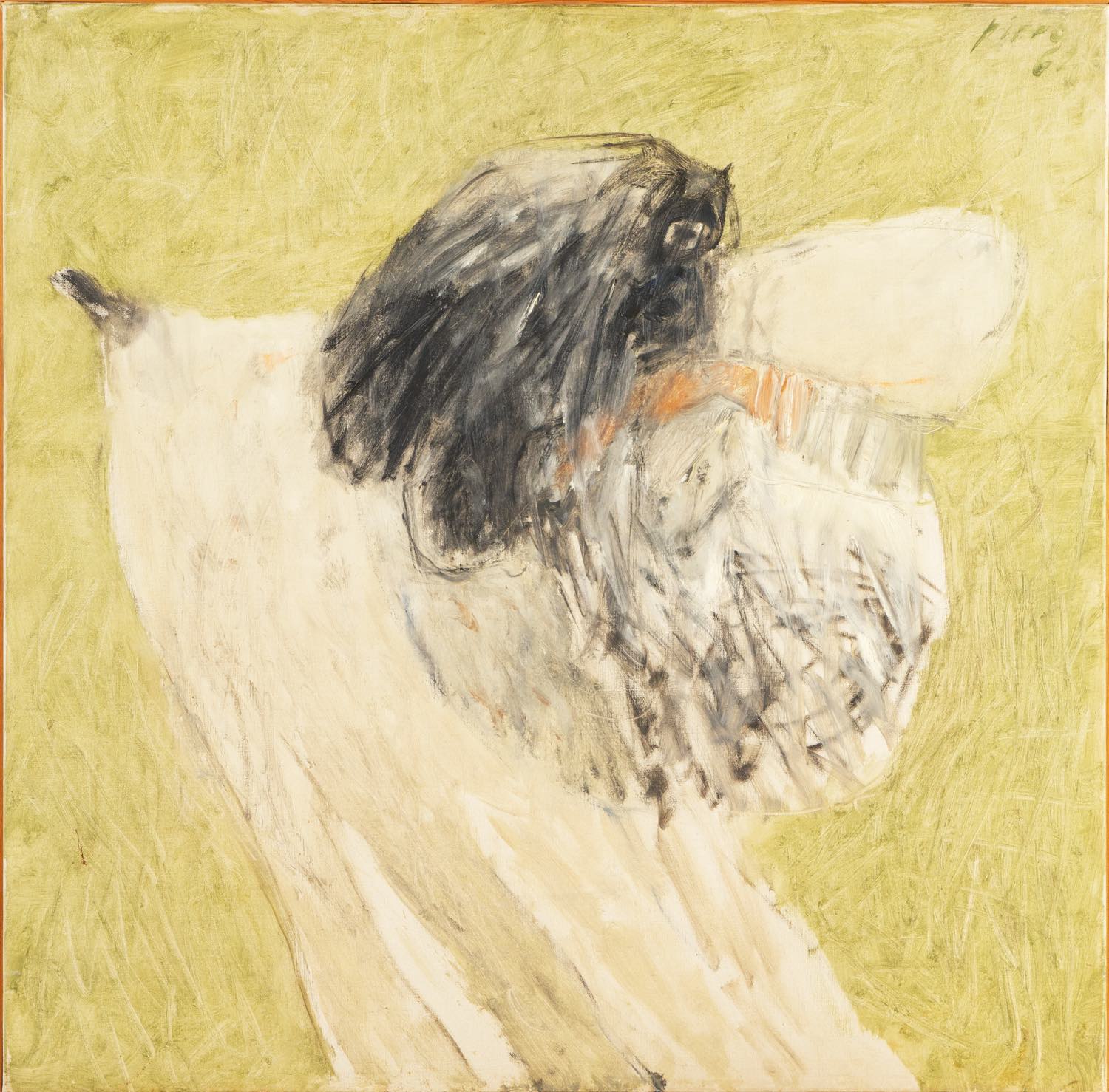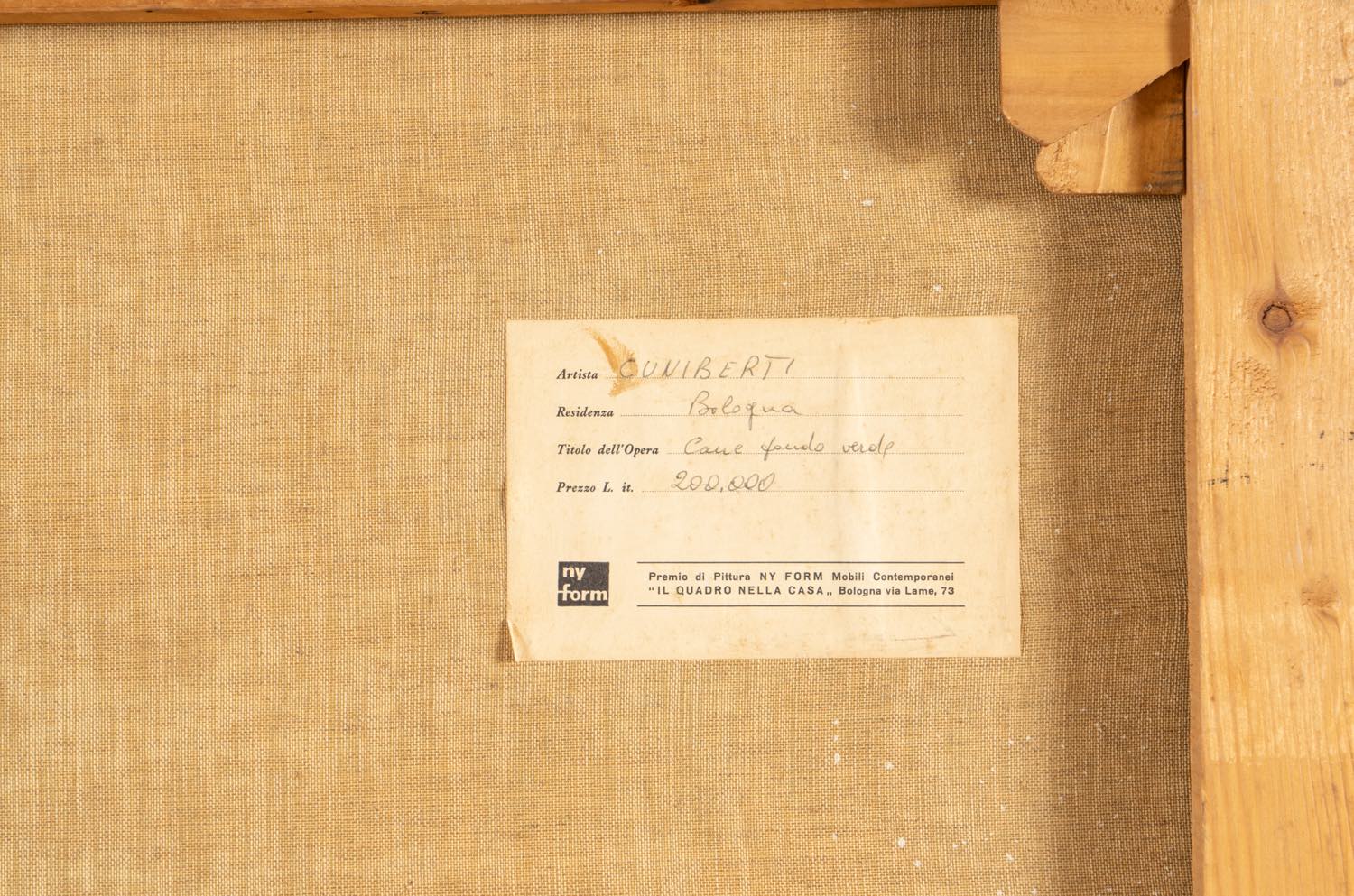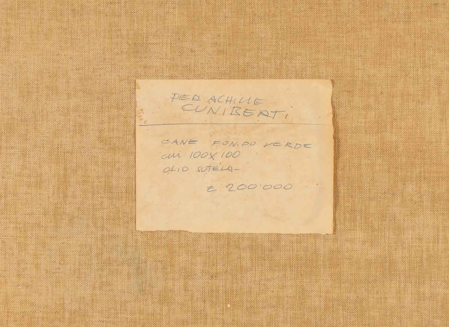 Pirro Cuniberti (Sala Bolognese 1923 - Bologna 2016), “Cane fondo verde”, 1962.Olio su tela, firmato e datato in alto a destra “Pirro/62”, reca al retro etichetta del Premio di Pittura NY FORM Mobili Contemporanei “IL QUADRO NELLA CASA” - Bologna con autore, luogo e titolo ed etichetta con autore, titolo, dimensioni e tecnica “Pier Achille/ Cuniberti/Cane fondo verde/cm 100x100/olio su tela” H cm 100x100