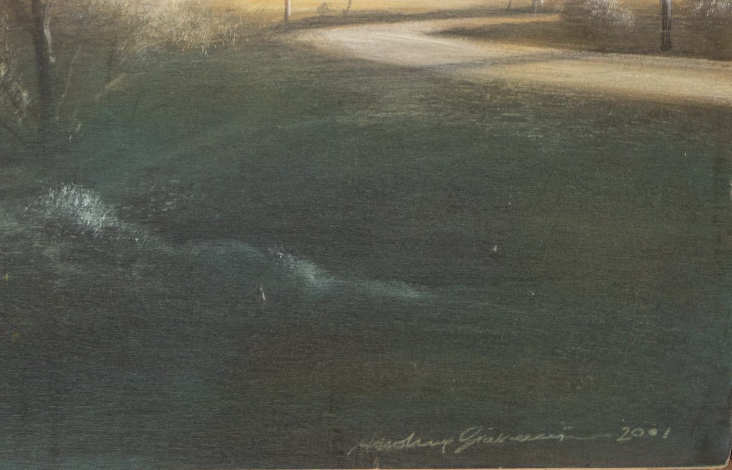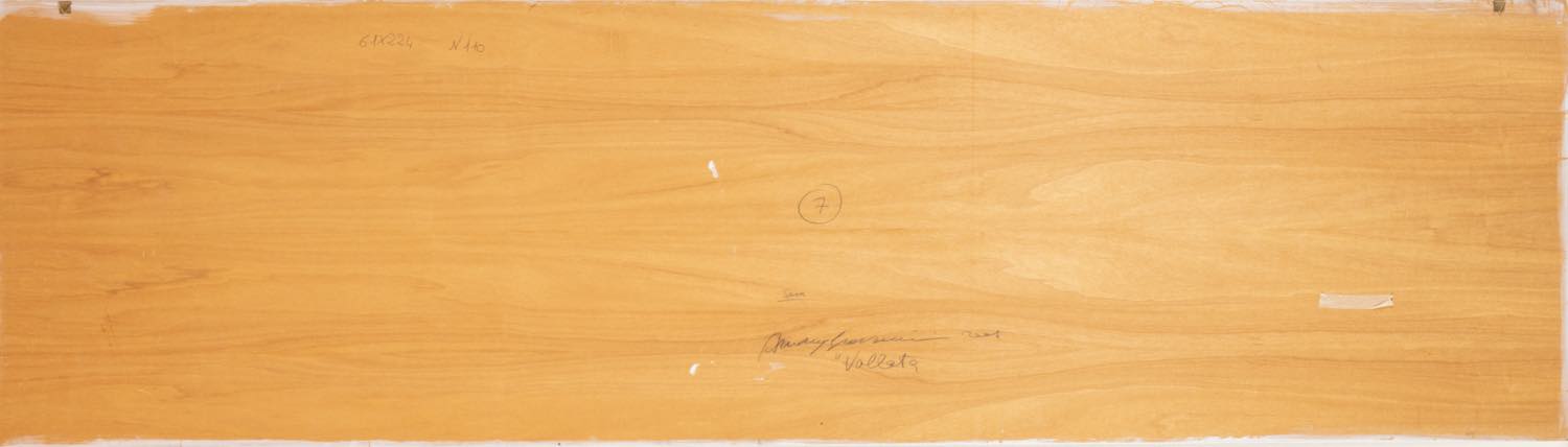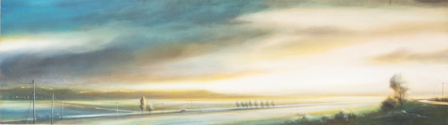 Andrea Giovannini (Lugo di Ravenna 1962), “Vallata”, 2001.Olio su tavola, firmato e datato in basso a destra “Andrea Giovannini 2001”, reca al retro iscrizioni “Andrea Giovannini 2001/Vallata”, 7 entro cerchio e “61x224 N 110”, H cm 61x224
