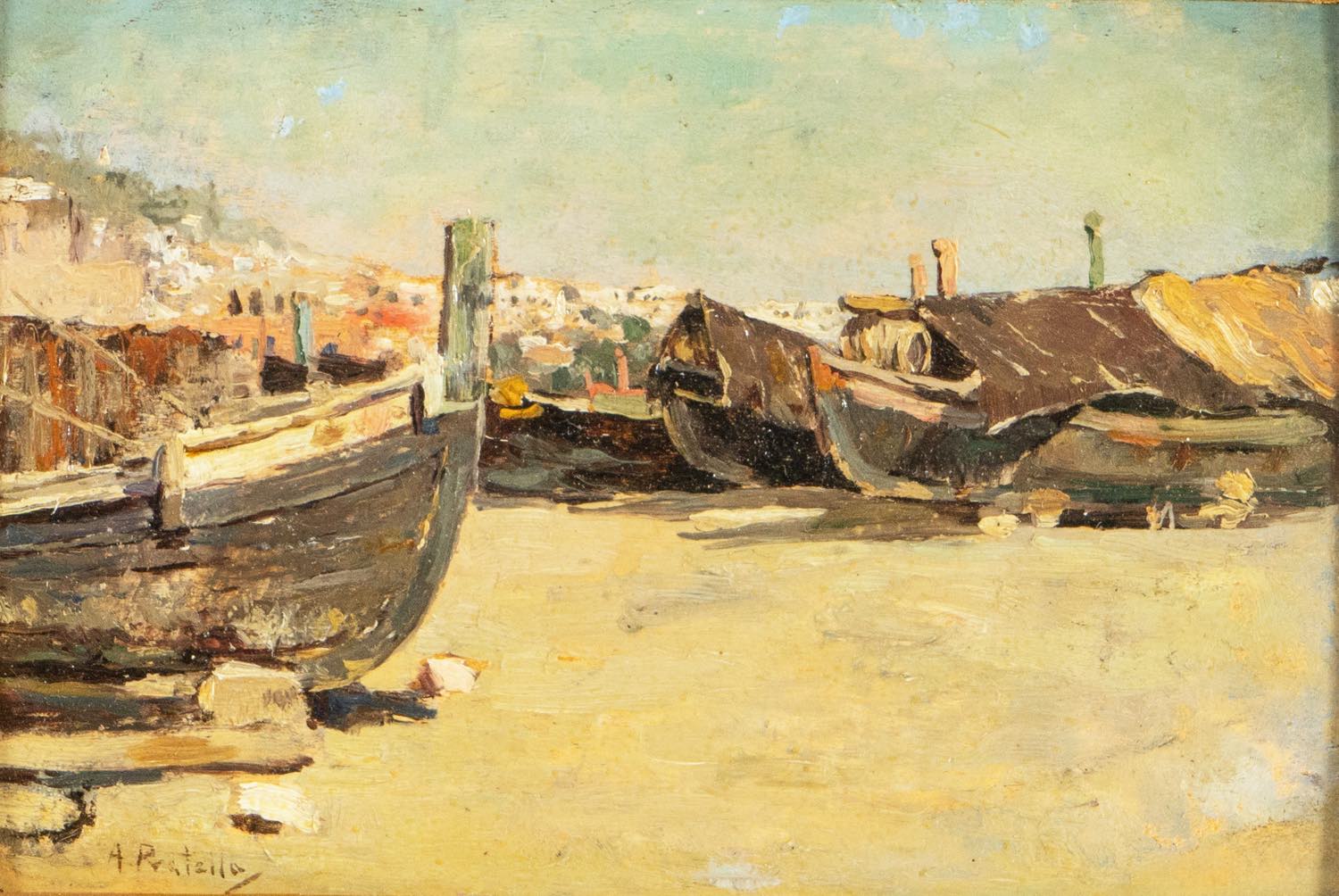Attilio Pratella (Lugo 1856 - Napoli 1949), “Barche”.Olio su tavoletta, firmato in basso a sinistra “A. Pratella”, reca al retro timbro Galleria d’Arte Parroncini - Firenze, H cm 13.5x19