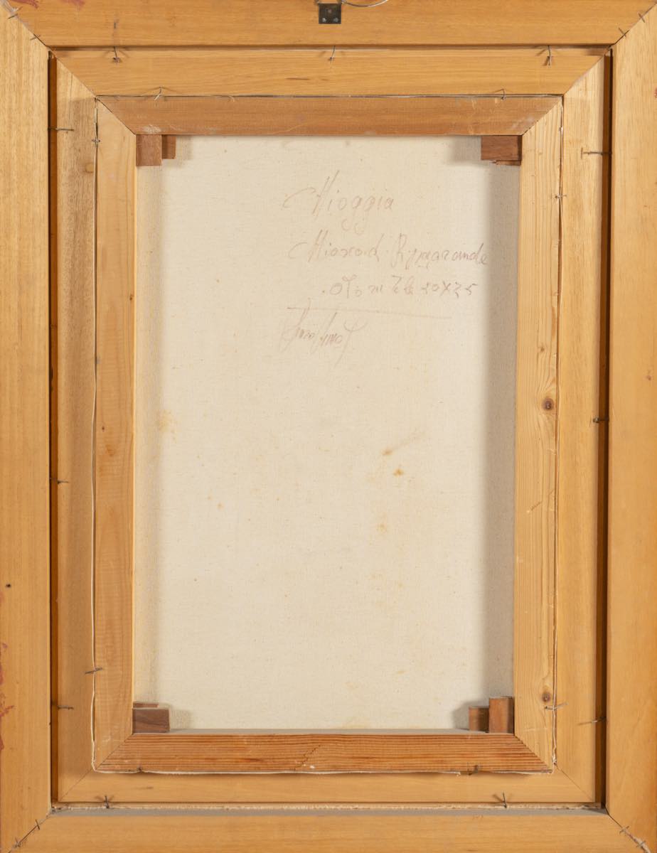 Renzo Piccoli (Codigoro 1938), “Chiosco di Ripagrande”.Olio su tela, firmato in basso a destra, reca al retro iscrizione con titolo, tecnica, dimensioni e firma dell’artista, H cm 75.5x50