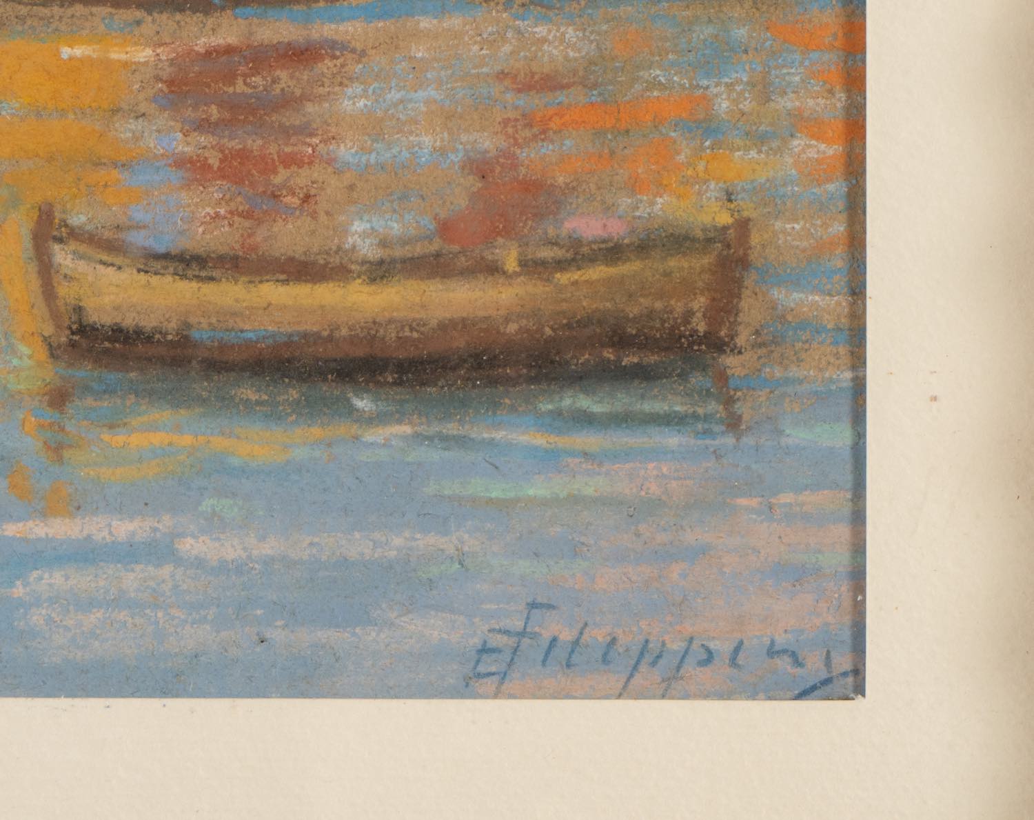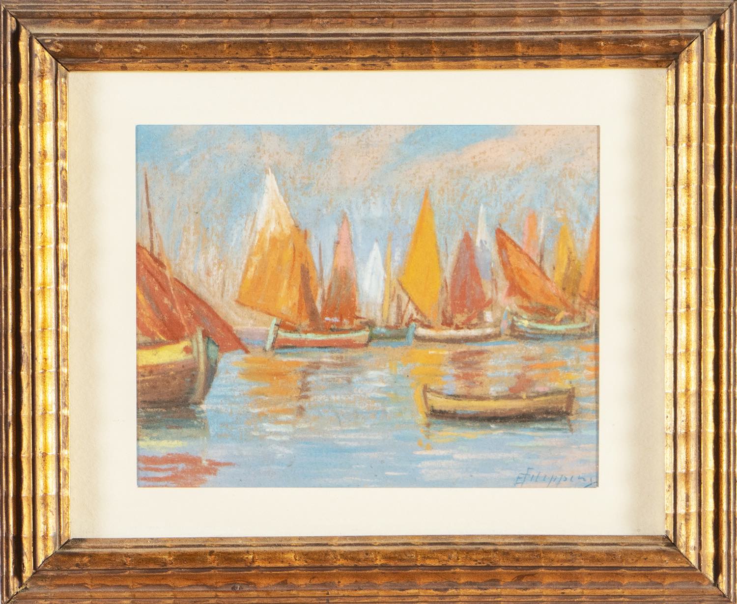 Emilio Filippini (Cattolica 1870-1938), “Marina con barche”.Pastello su carta, firmato in basso a destra, H cm 17x22