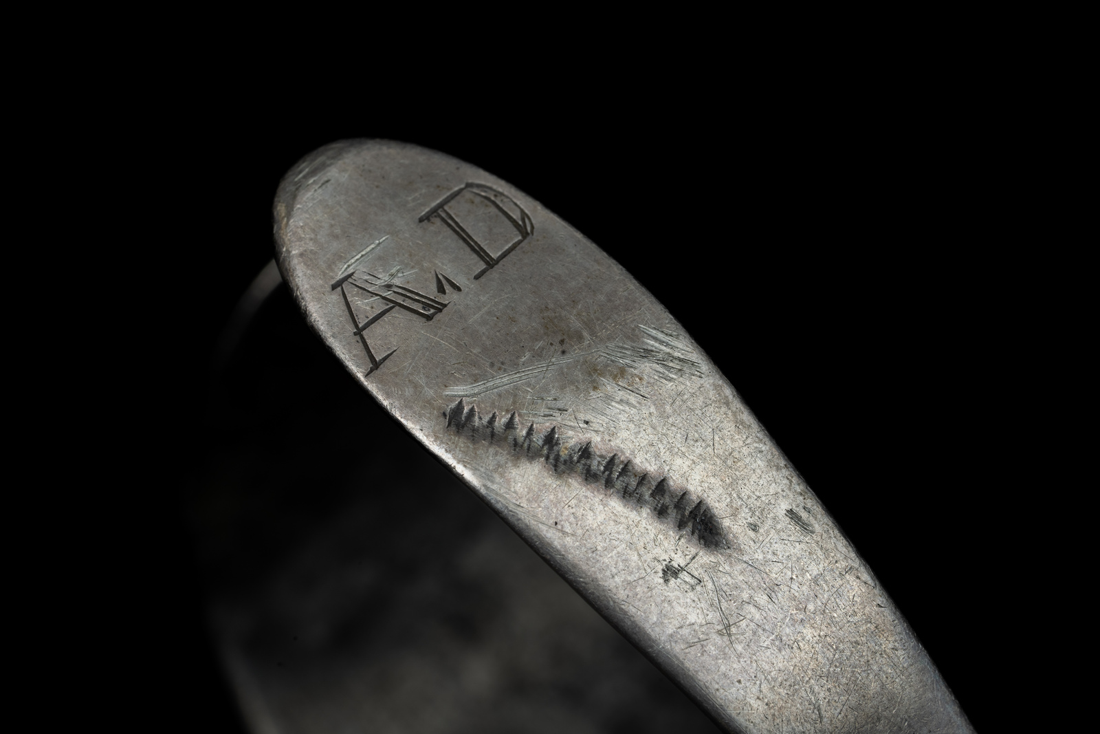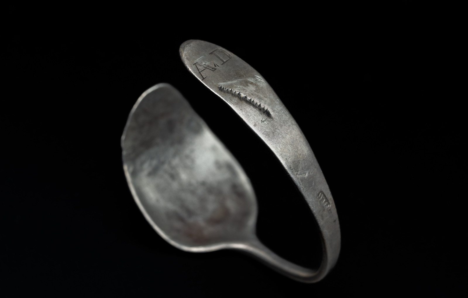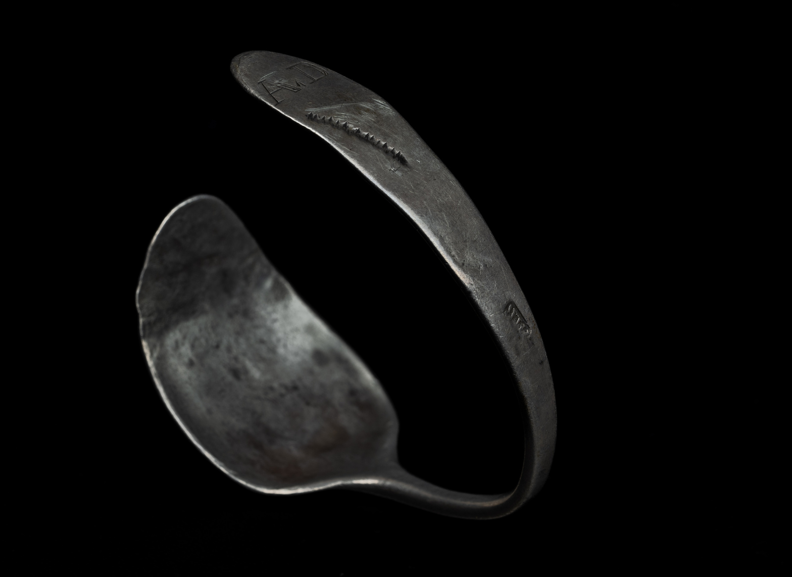 Il cucchiaino/bracciale risulta punzonato ed anche testato con un saggio a zig zag proprio sotto le cifre della proprietaria iniziale.