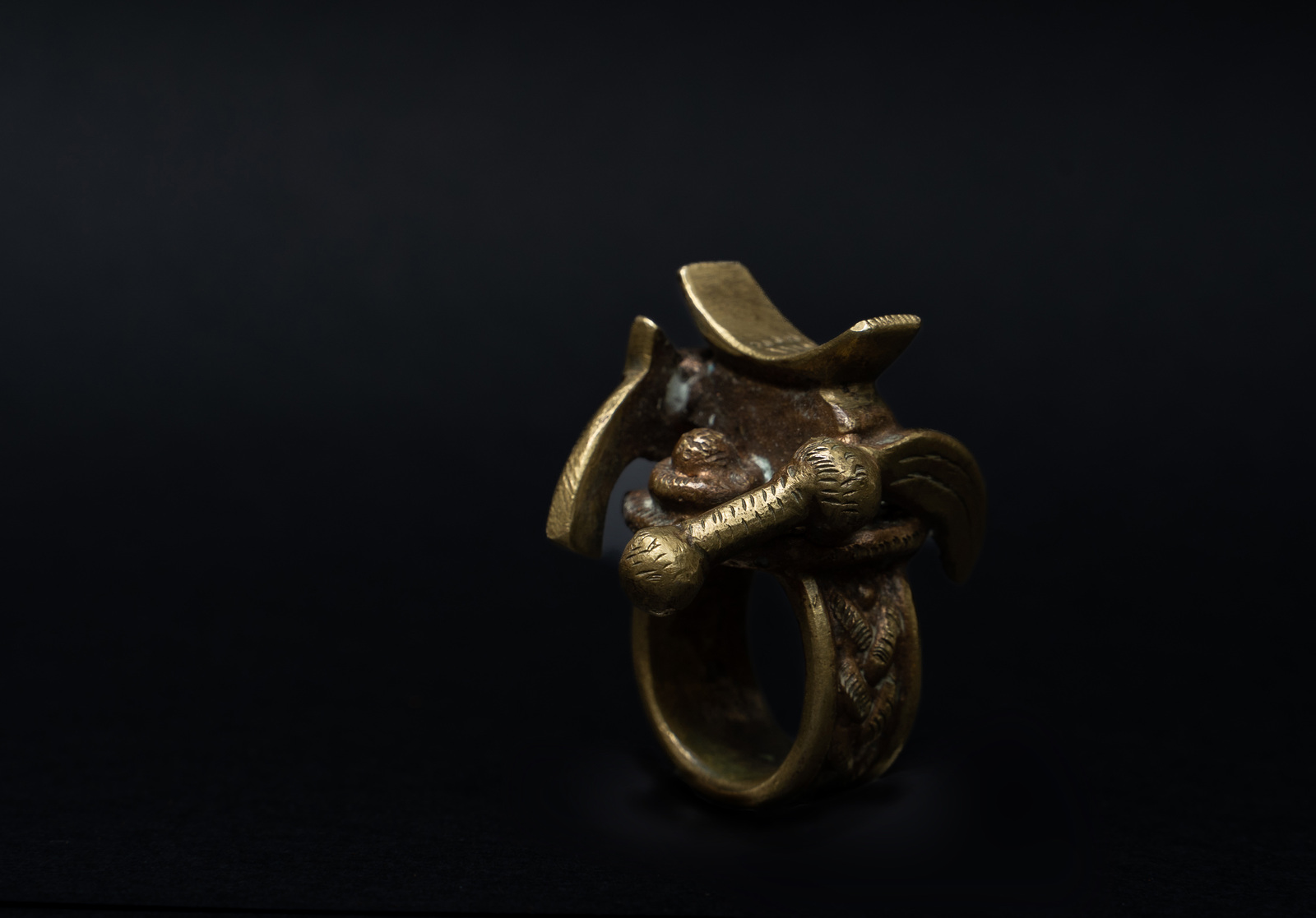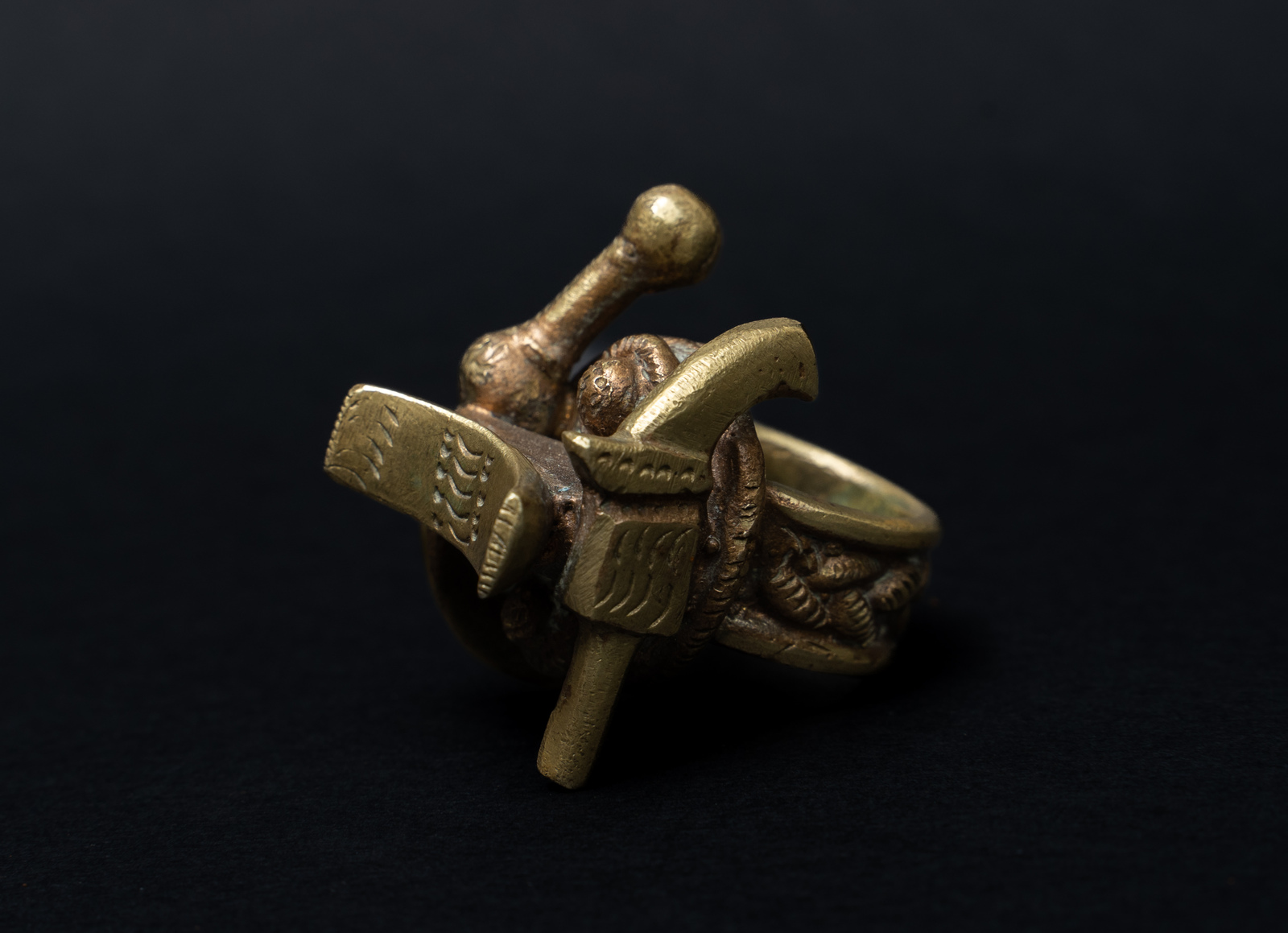 Ottone. . Cm 2,80 x 4,30 x 3,60. Non particolarmente antico, ma di grande fascino questo anello Ashanti indiscutibilmente rappresentativo del modo di pensare africano. Nell' accurata fusione di questo anello troviamo infatti riprodotti insieme una pistola colt, una spada Ashanti ed un poggiatesta quasi a suggerire che chi è molto armato dorme sonni tranquilli.