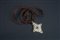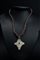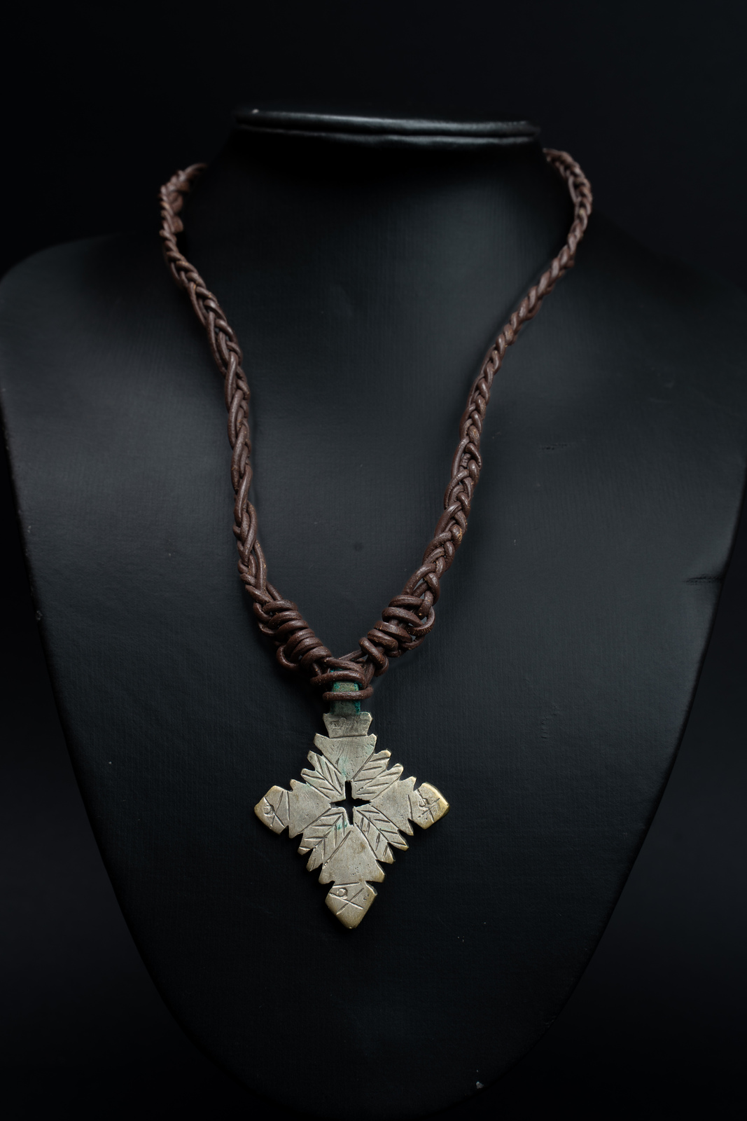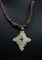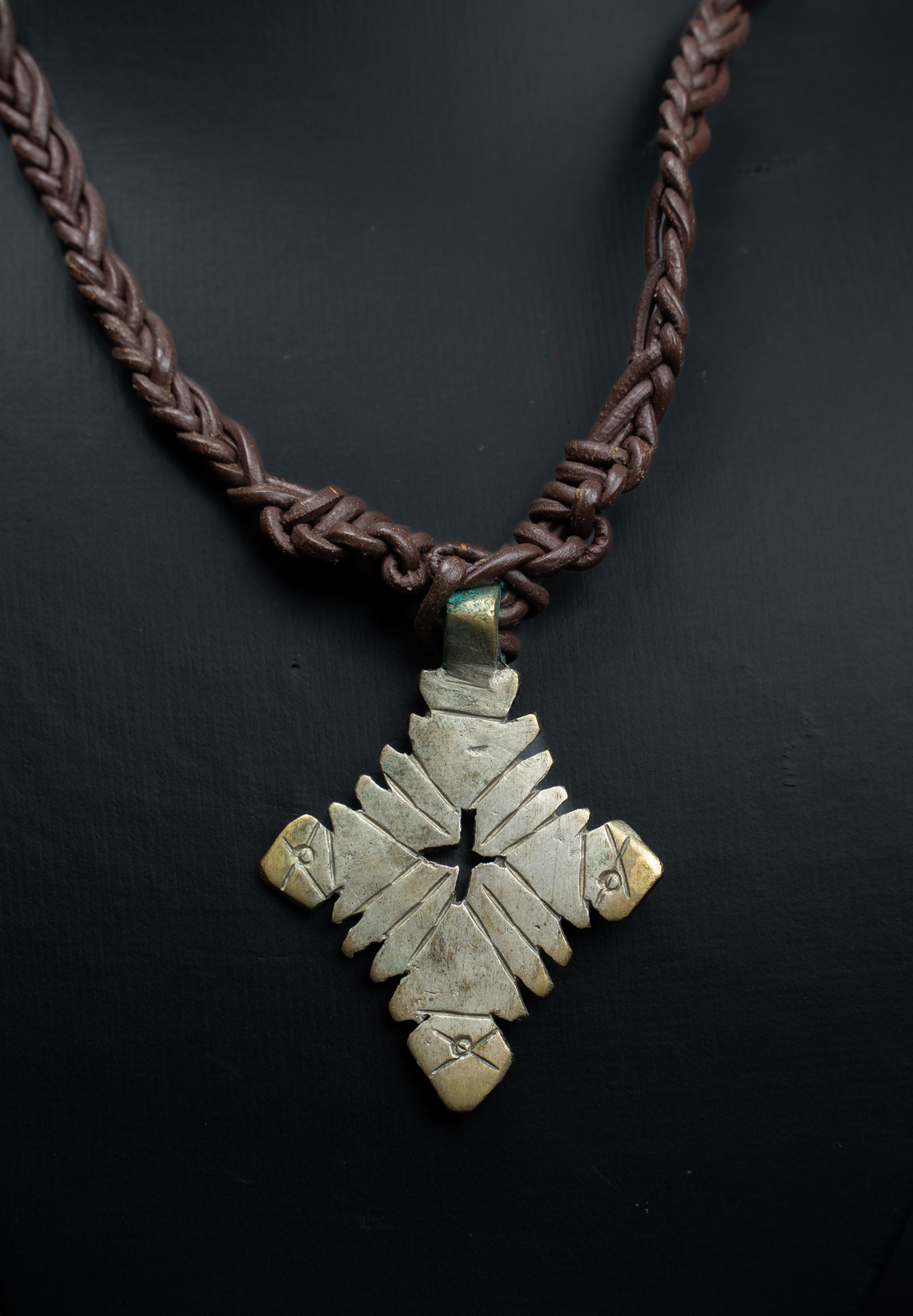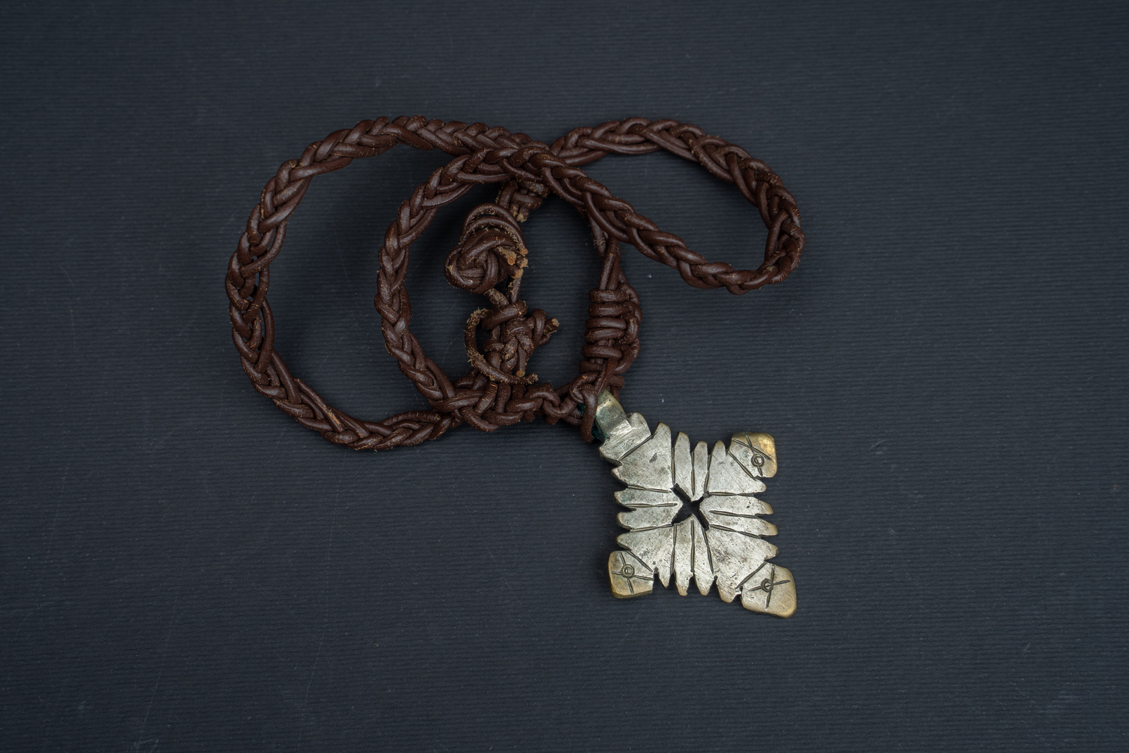 Ottone argentato e cuoio. . Cm 4,20 x 6,00 x 1,00. Primitiva croce in ottone argentato pervenutaci con il cordoncino originale di cuoio intrecciato con cui veniva indossata al collo.