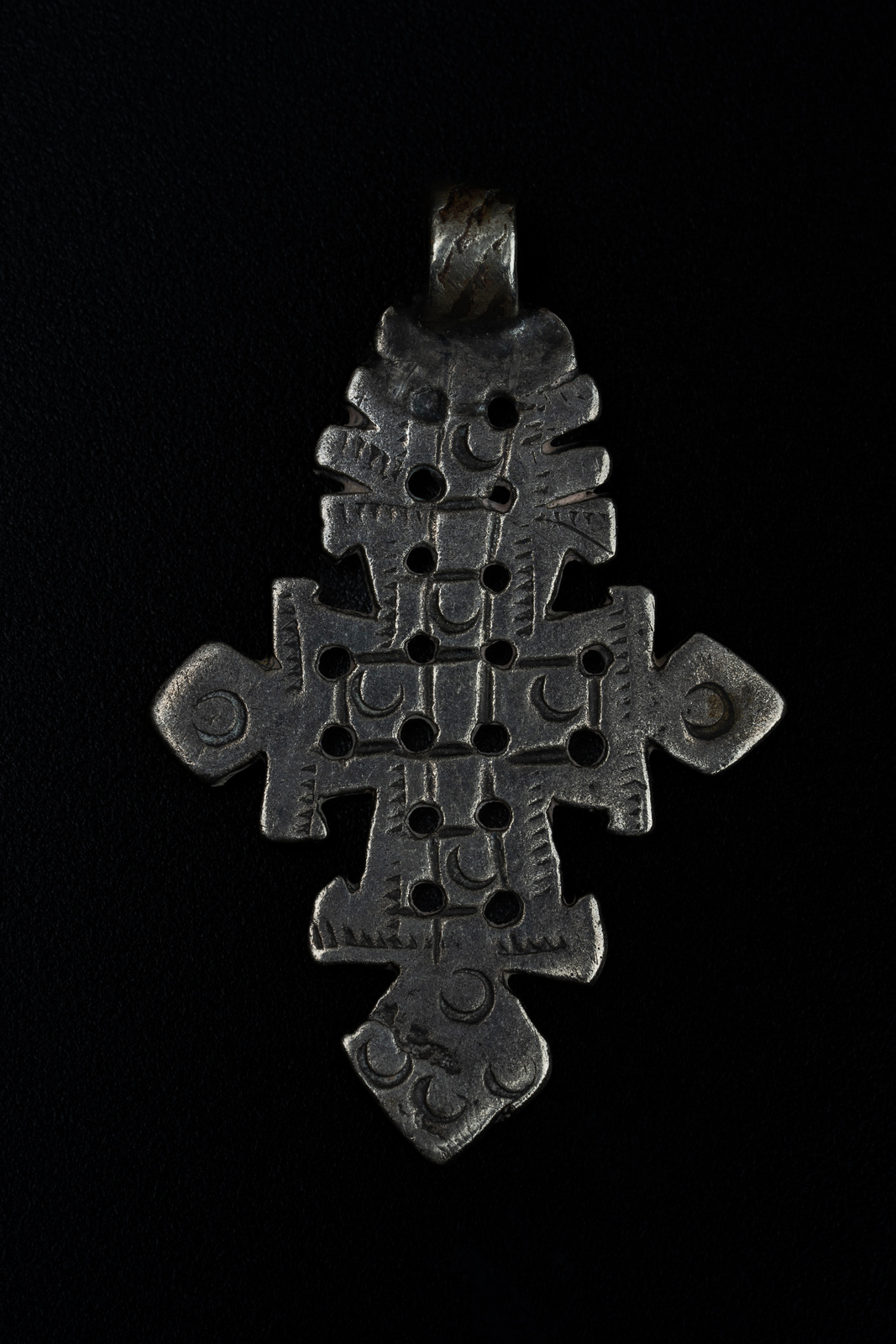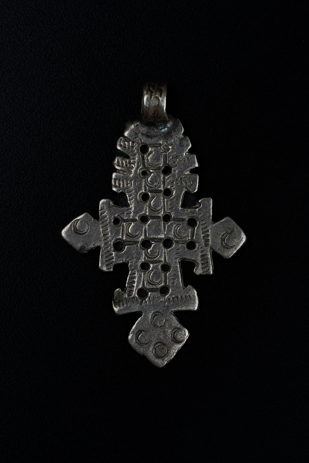 Argento. . . Cm 3,20 x 4,80 x 1,00. Bella croce copta traforata ed incisa con motivi a mezzaluna.