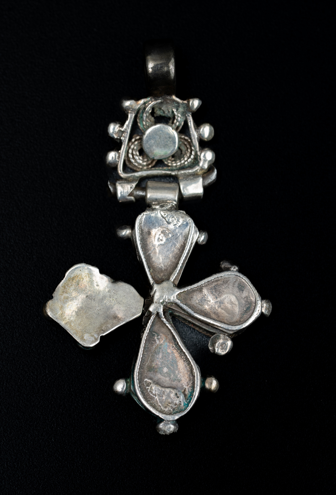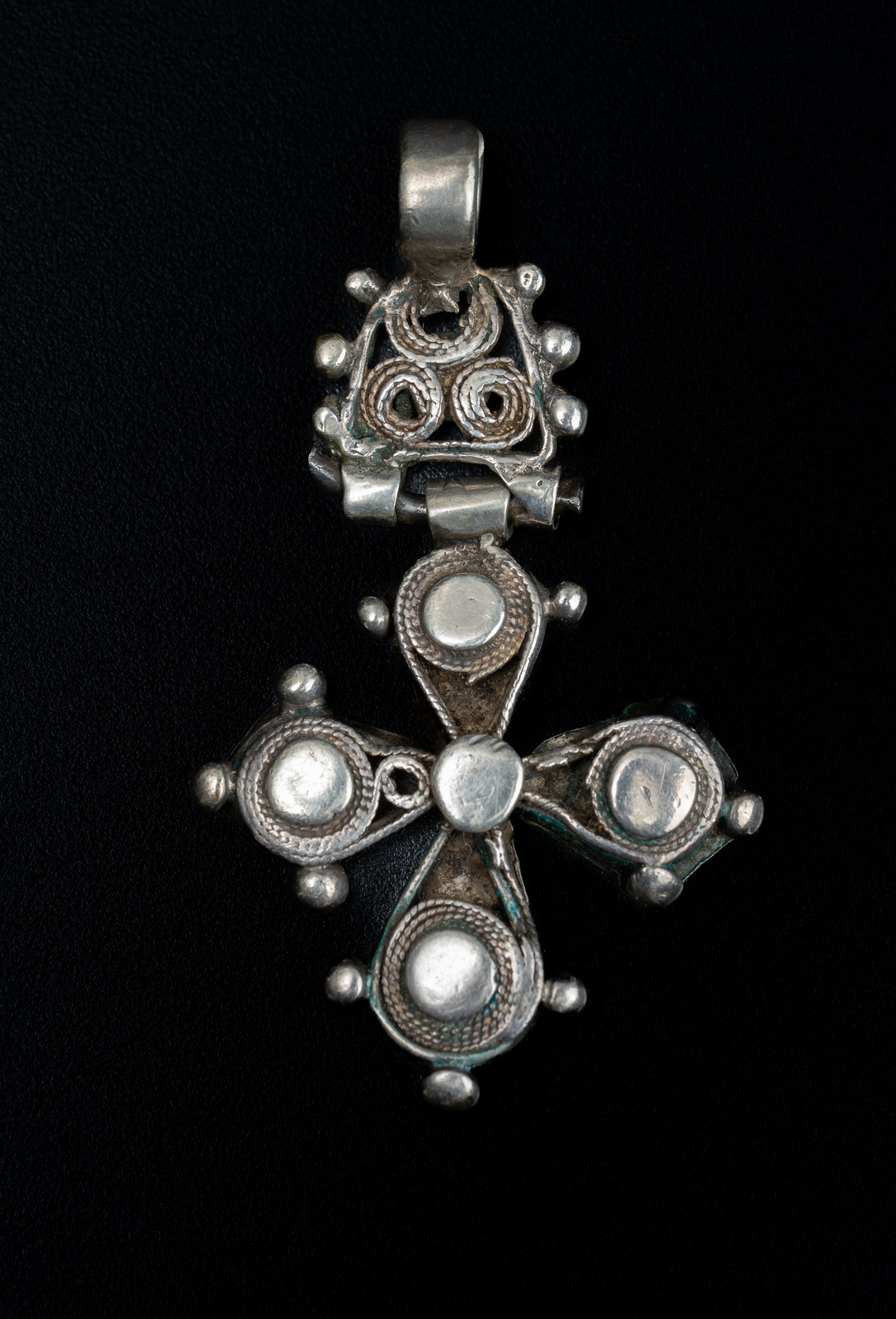 Argento. . Cm 3,60 x 6,30 x 1,00. Bella ed antica croce copta in argento con bella patina, piccoli difetti e notevoli segni d'uso.