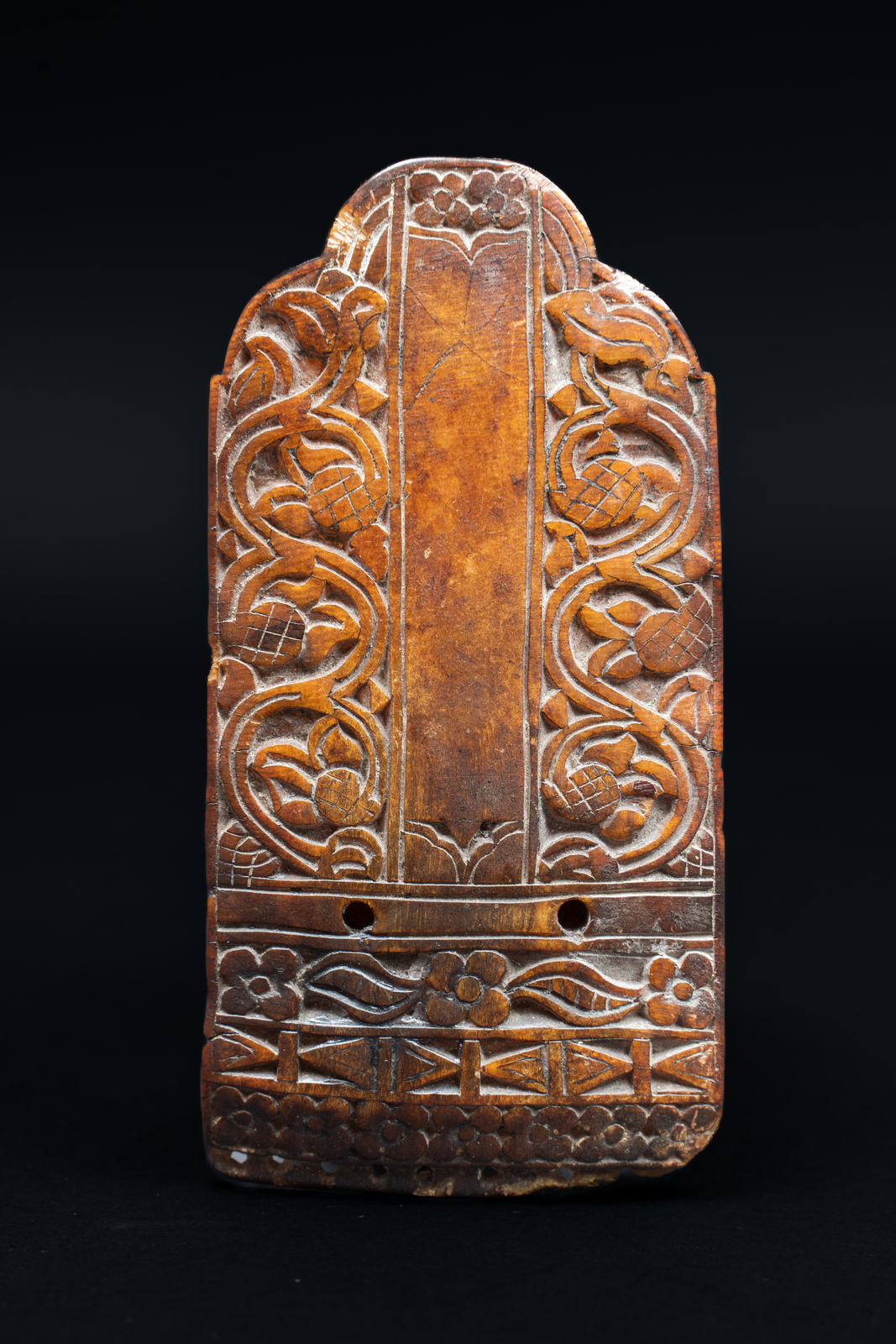 Sapientemente realizzato in corno sagomato, forato e finemente inciso a motivi floreali e con una notevole patina donata dal tempo e dall'usura, questo particolare e raro oggetto d'arte primitiva sembra essere uscito dalla notte dei tempi di una qualsiasi zona della regione himalayana.