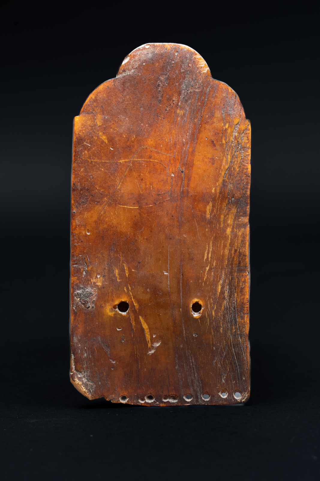 Corno. . Cm 6,20 x 12,60 x 0,50. Difficile stabilire una esatta zona di provenienza per questo splendido ed antico monile che con ogni probabilità veniva indossato sulla fronte o sul capo assicurato ai due fori centrali da legacci come insegna di rango.