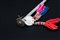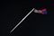 1899. 1899. . Cm 2,50 x 24,00. Spillone per capelli in alluminio inciso a motivi astratto-geometrici ed abbellito con nappe colorate e monete.