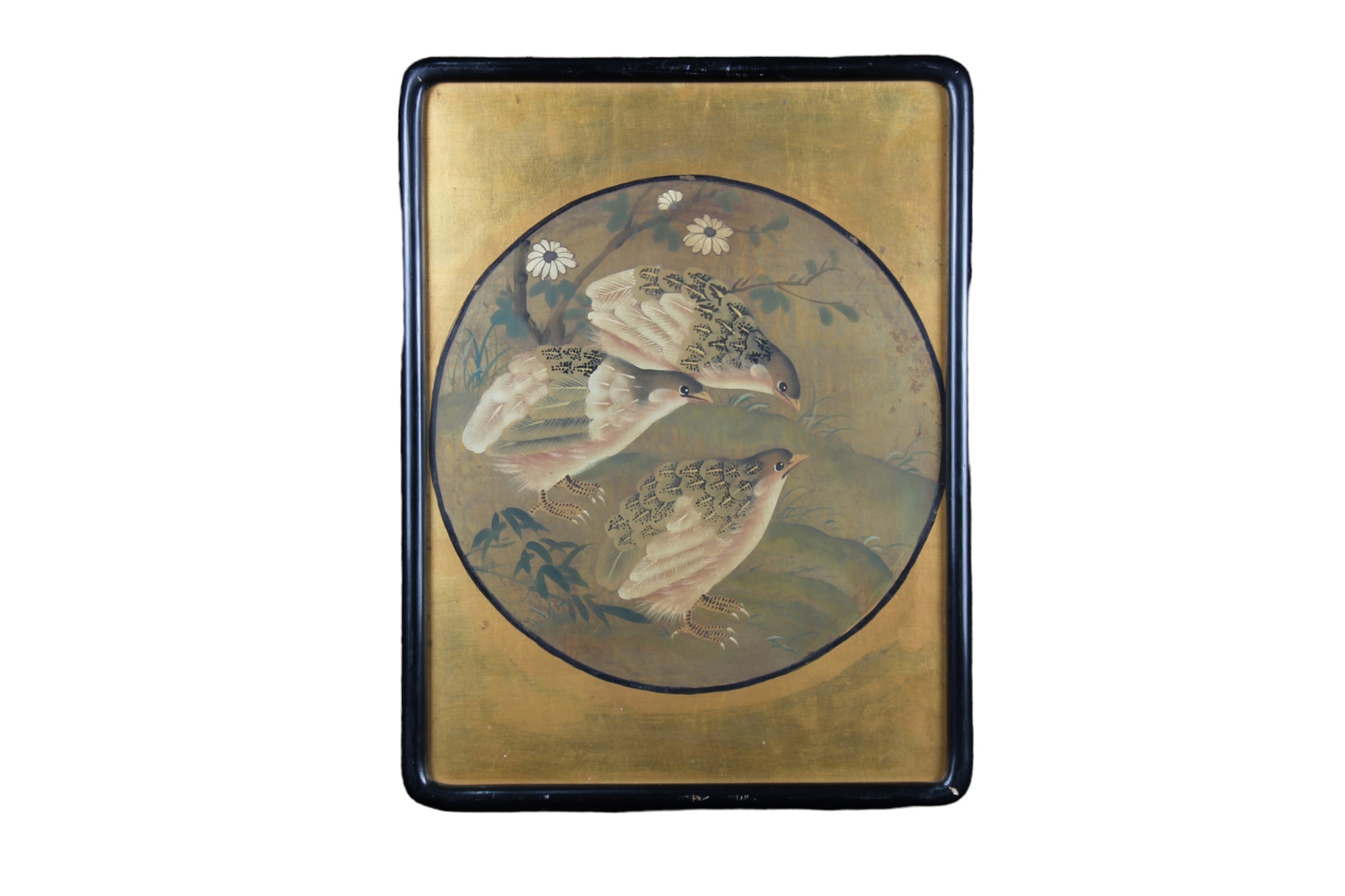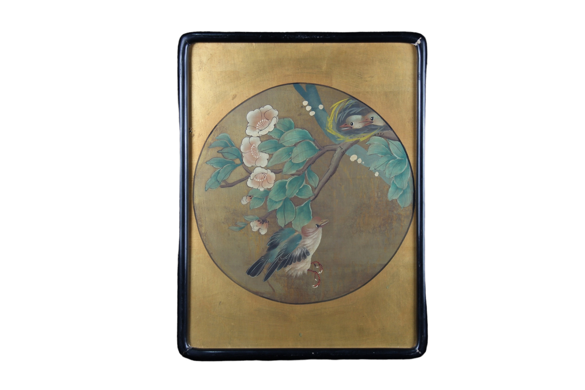 COPPIA DI PANNELLI DIPINTI SU COMPENSATO FONDO ORO Raffiguranti Fauna e flora nello stile orientale dentro cornici in legno ebanizzato. Inghilterra xx secolo . h cm 53 X 40,5